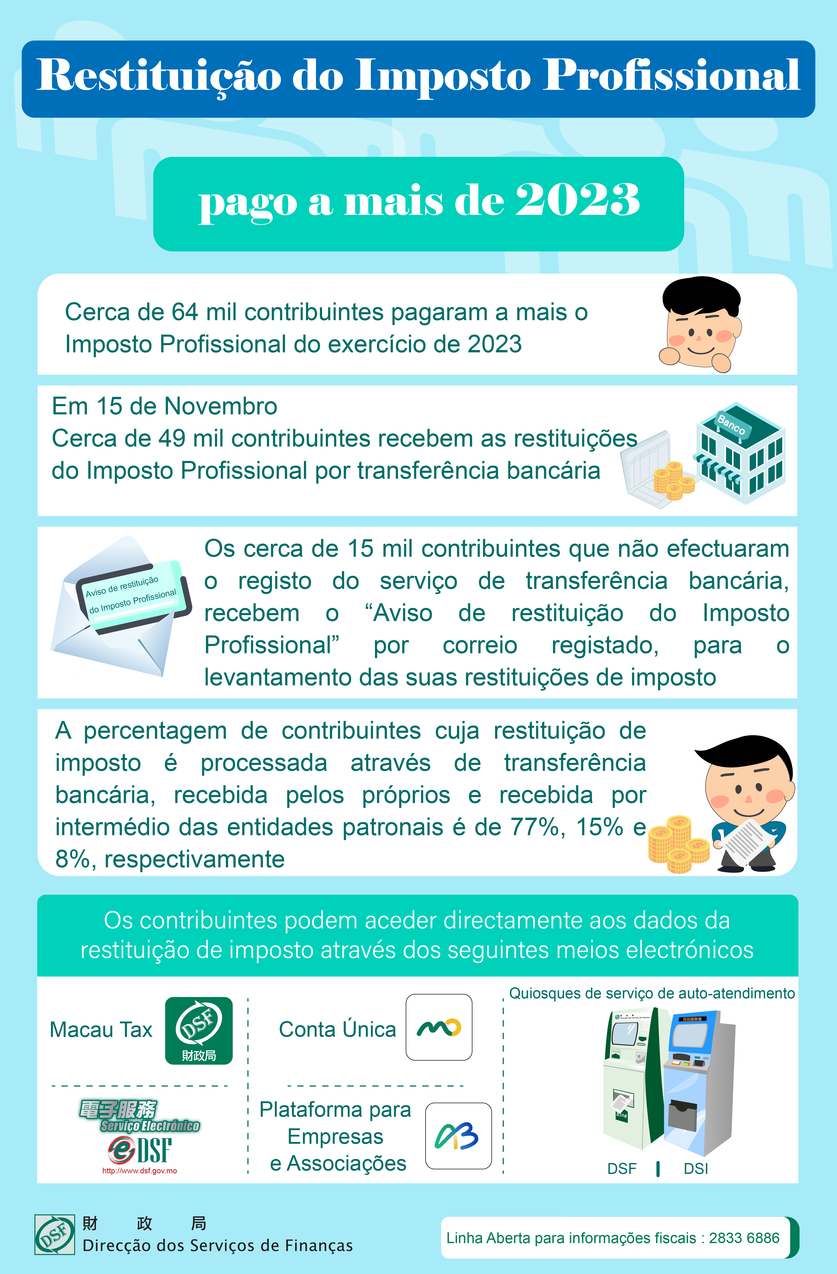 Desde 1 de Novembro, os contribuintes podem consultar os dados de restituição do Imposto Profissional pago a mais do exercício de 2023, através da aplicação da DSF “Macau Tax”, da “Conta Única”, da “Plataforma para Empresas e Associações”, do “Serviço Electrónico” da DSF, e ainda, dos quiosques de serviços de auto-atendimento da DSF e da Direcção dos Serviços de Identificação.