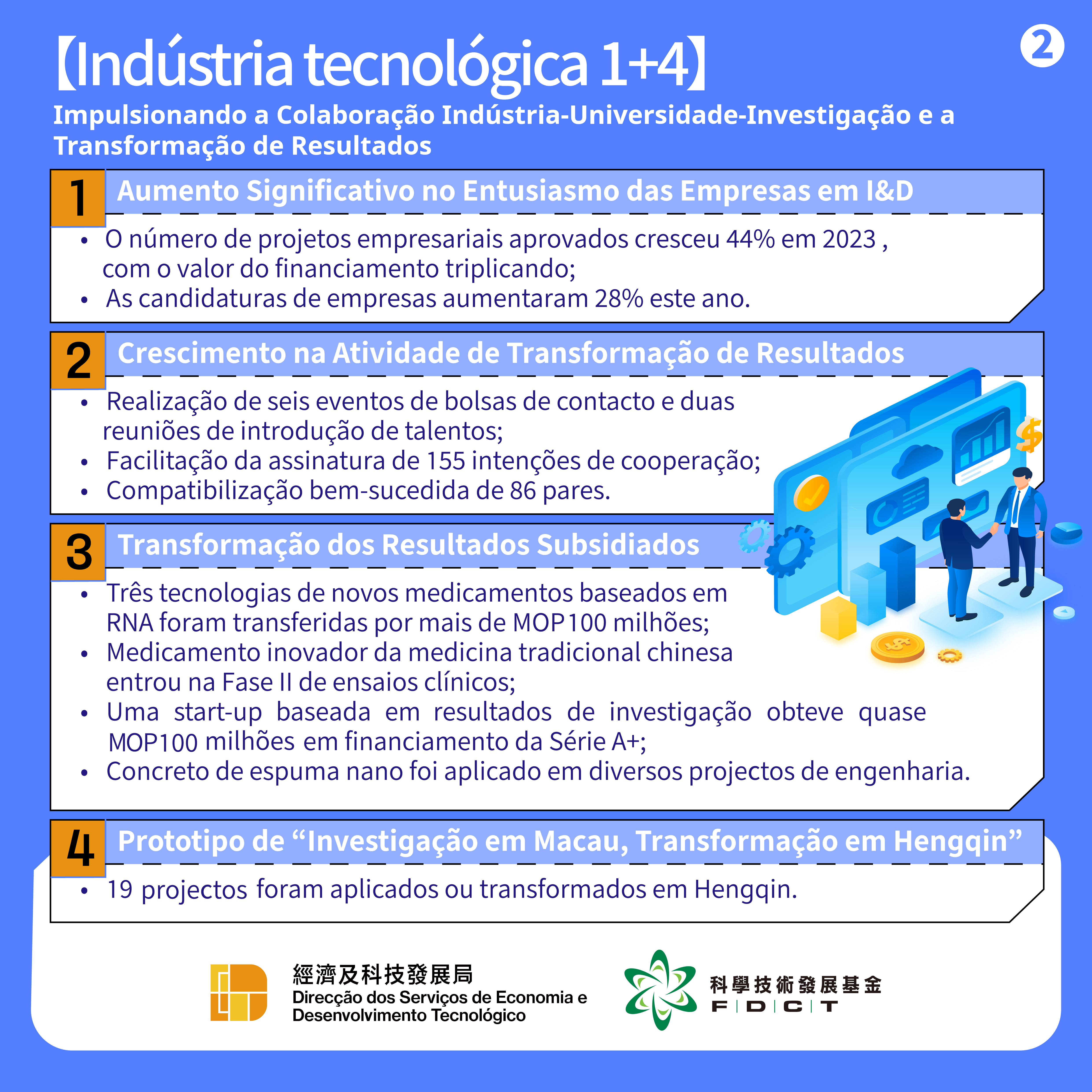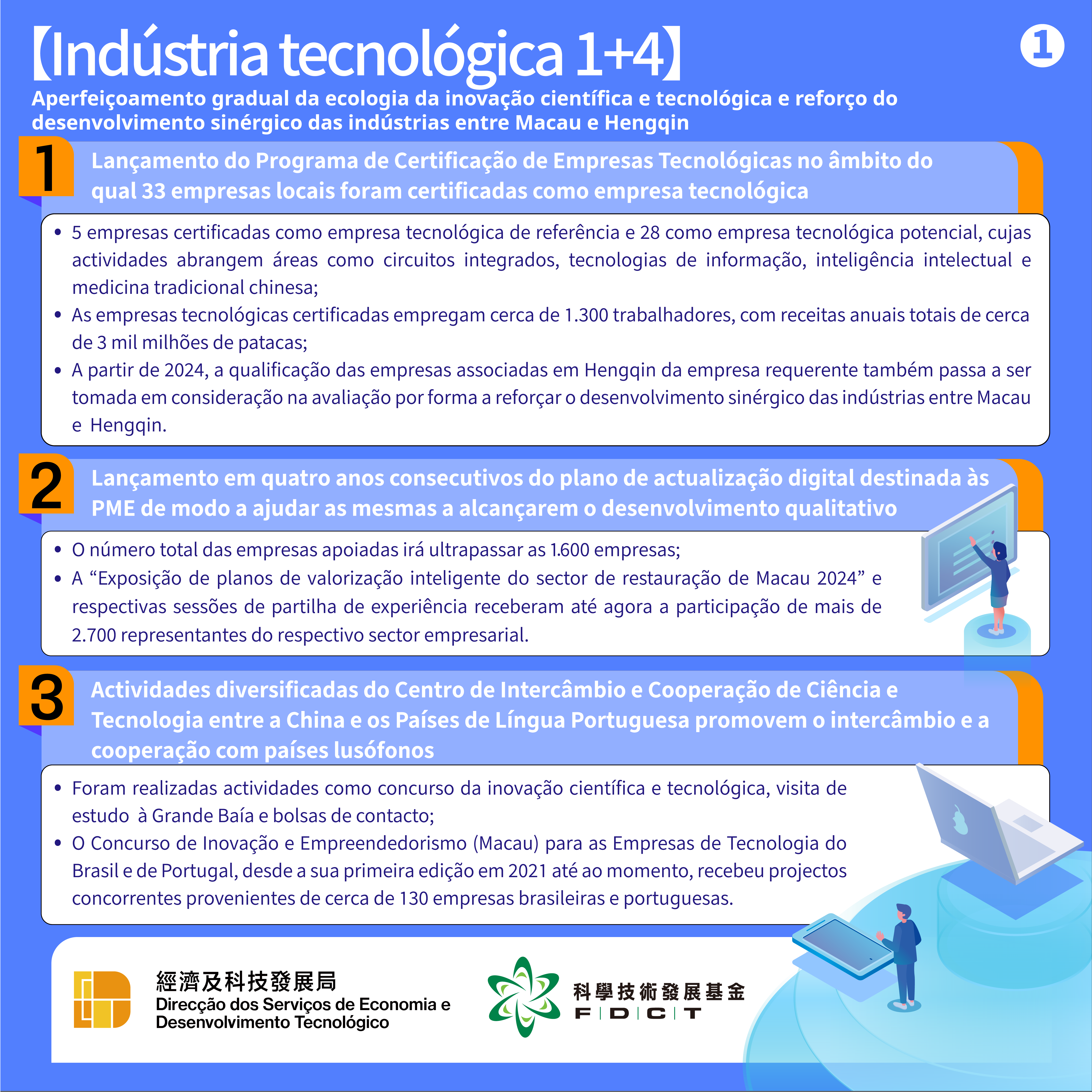 Para continuar a promover a estratégia de desenvolvimento da diversificação adequada “1+4”, nos últimos anos, o Governo da RAEM tem-se empenhado no aperfeiçoamento do sistema de inovação científica e tecnológica, tendo lançado o “Programa de Certificação de Empresas Tecnológicas” e aperfeiçoado continuadamente o sistema de apoio financeiro, promovido empenhadamente a investigação e o desenvolvimento das empresas, a cooperação indústria-universidade-investigação, a transformação dos resultados e o desenvolvimento sinergético com Hengqin, de modo a promover, de forma contínua, o desenvolvimento da indústria científica e tecnológica.