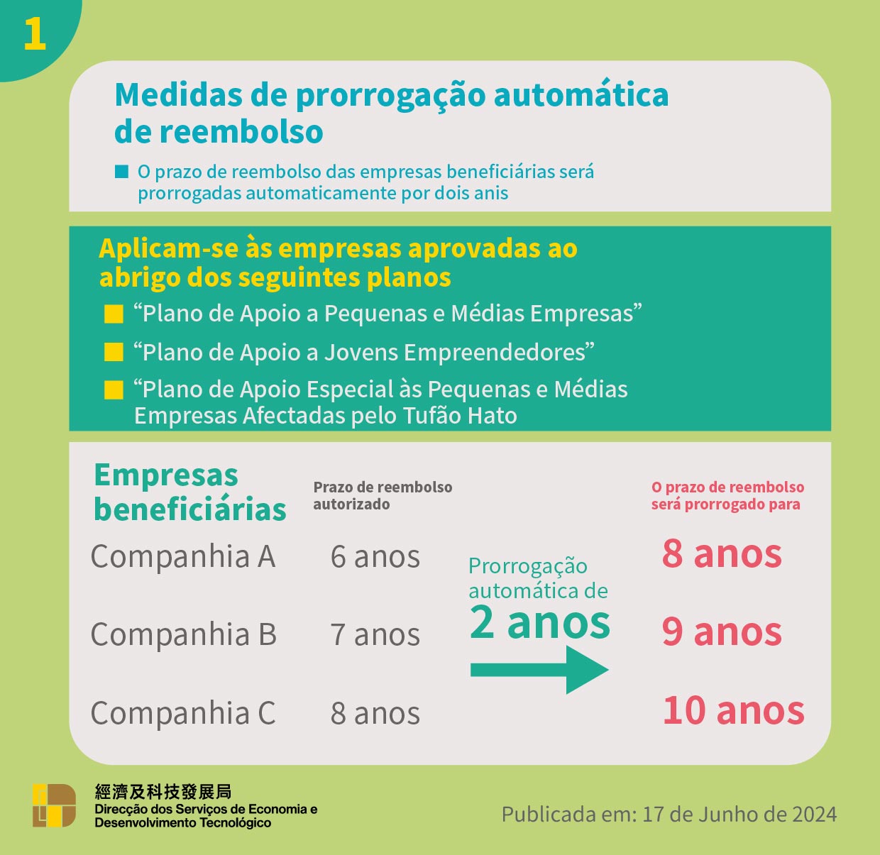 Com vista a aliviar a pressão do reembolso dos empréstimos por parte das PME, o Governo da RAEM, através do Regulamento Administrativo n.º 22/2024, prorroga o prazo máximo de reembolso dos empréstimos concedidos nos termos dos planos acima referidos, de oito para dez anos, com efeitos a partir de 18 de Junho de 2024. A DSEDT informará, de forma ordenada e por grupos, as empresas beneficiárias, através de mensagem de telemóvel e ofício, sobre o ajustamento do prazo de reembolso, sem necessidade de apresentação do pedido, a fim de atingir o objectivo de facilitar a vida da população e dos empresários.