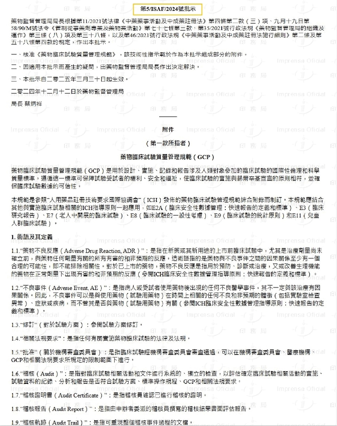 As instruções técnicas sobre as “Boas práticas clínicas de medicamentos (GCP)” foram elaboradas com referência à vigente Adenda Integrada das Boas Práticas Clínicas, publicada pelo Conselho Internacional de Harmonização de Requisitos Técnicos para Produtos Farmacêuticos para Uso Humano (ICH), e em articulação com as necessidades do desenvolvimento dos ensaios clínicos da medicina tradicional chinesa em Macau, com o objectivo de controlar rigorosamente todo o processo de ensaios clínicos de medicamentos, fornecendo dados completos, precisos e verdadeiros sobre a eficácia e a segurança dos medicamentos e garantindo os direitos, a segurança e o bem-estar dos sujeitos do ensaio. As GCP fornecem um suporte importante para a realização dos ensaios clínicos, articulando-se com os recursos dos dois Laboratórios de Referência do Estado para Investigação de Qualidade em Medicina Chinesa de Macau, das instituições de ensino superior e das instituições de investigação e desenvolvimento clínico, entre outros, podendo, através dos ensaios clínicos, transformar os resultados da investigação científica em aplicações clínicas, no sentido de promover o desenvolvimento da investigação farmacêutica e dos medicamentos inovadores de Macau.