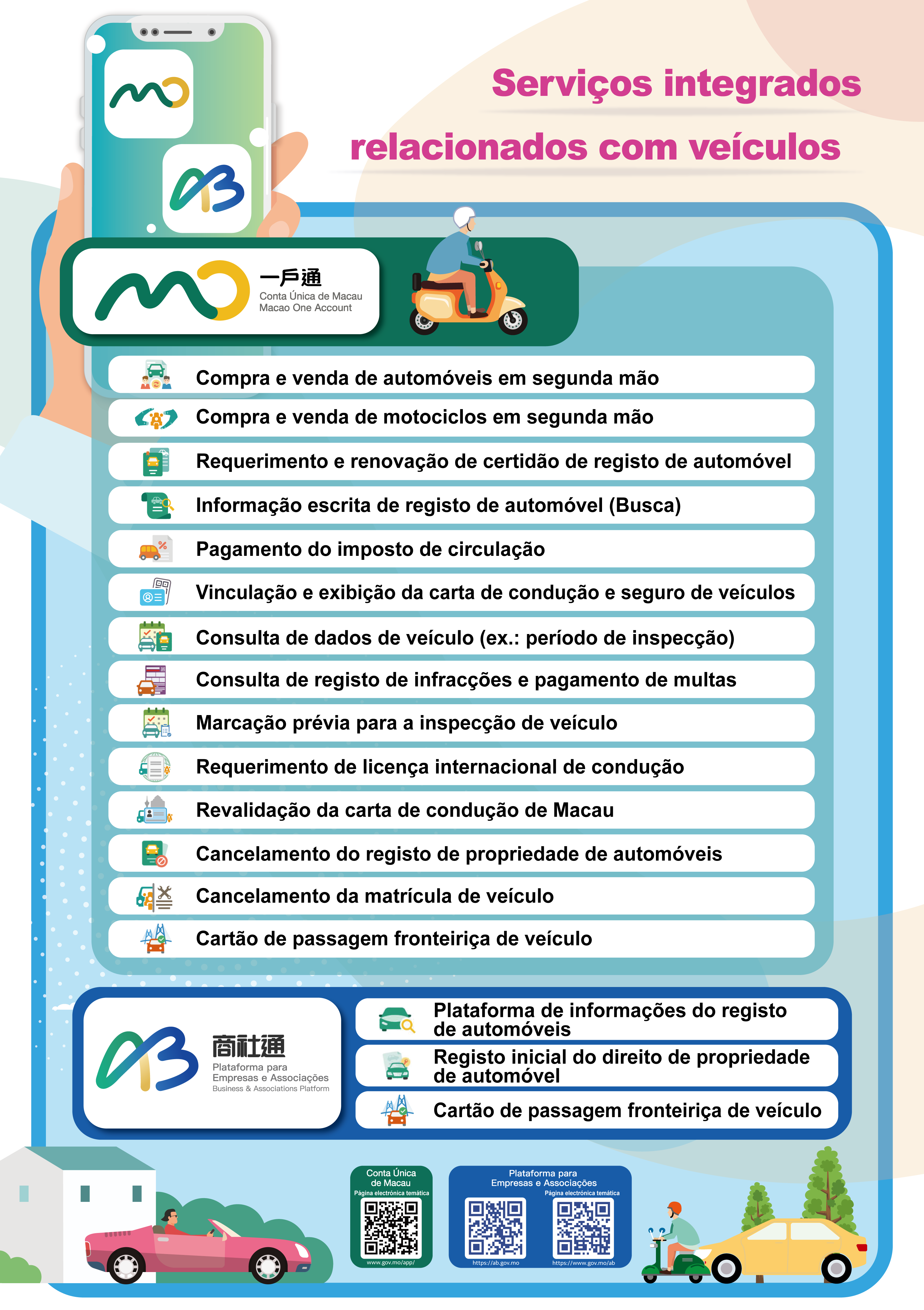 Actualmente, a Conta Única de Macau e a Plataforma para Empresas e Associações disponibilizam vários serviços integrados relacionados com veículos, 17 dos quais são prestados através da Conta Única de Macau e abrangem a vinculação e exibição da carta de condução e apólice de seguro digitalizados, consulta dos dados de veículo (por exemplo do período de inspecção), consulta do registo de infracções e pagamento de multas, marcação prévia para inspecção de veículo, revalidação da carta de condução de Macau, entre outras formalidades. Na Plataforma para Empresas e Associações, por sua vez, são prestados três serviços integrados relacionados com o registo inicial do direito de propriedade de automóvel e com a plataforma de informações do registo de automóveis. Por outro lado, o serviço de Cartão de Passagem Fronteiriça de Veículo também já se encontra disponível na Conta Única de Macau e na Plataforma para Empresas e Associações. A prestação de tais serviços integrados contribui para reduzir a necessidade de deslocação pessoal dos cidadãos aos diversos serviços para a apresentação de requerimentos e o posterior tratamento, optimizando-se assim a experiência dos utentes e a eficiência dos serviços.