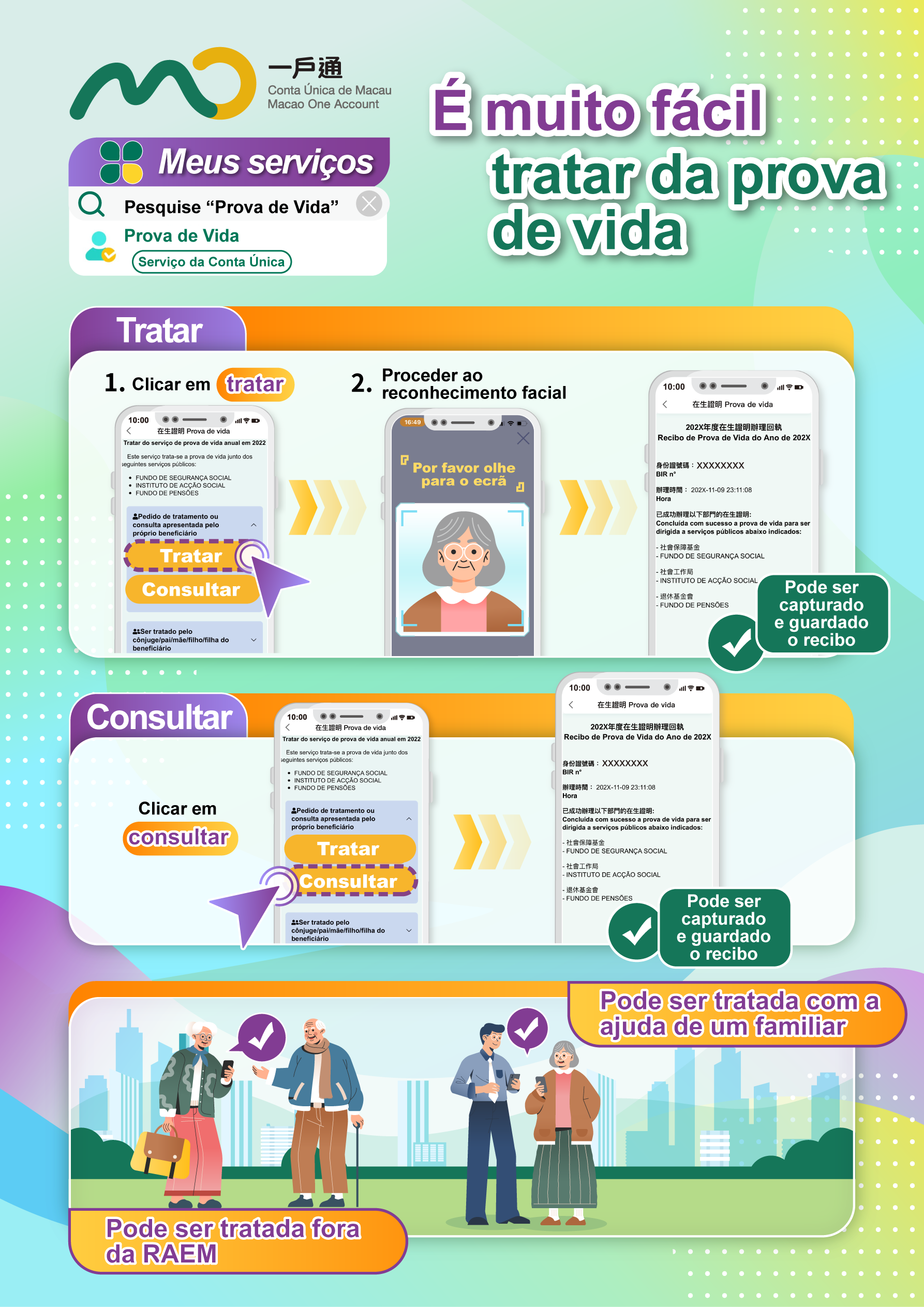 Ao efectuarem as formalidades, os beneficiários que já tenham a Conta Única de Macau aberta apenas precisam de aceder à sua conta, clicar na “Prova de vida”, proceder ao reconhecimento facial e concluir as formalidades naquele instante, isto desde que o reconhecimento facial seja feito com sucesso. Se o cônjuge ou algum dos familiares da linha recta (entre pais e filhos) do beneficiário já tiverem a Conta Única de Macau aberta, também podem ajudar o beneficiário a realizar a prova de vida através dessa conta. Após a realização da prova de vida, os cidadãos recebem uma mensagem de confirmação ou podem também optar por captar uma imagem para guardar o resultado ou consultar, a qualquer momento, o andamento das formalidades através da Conta Única.