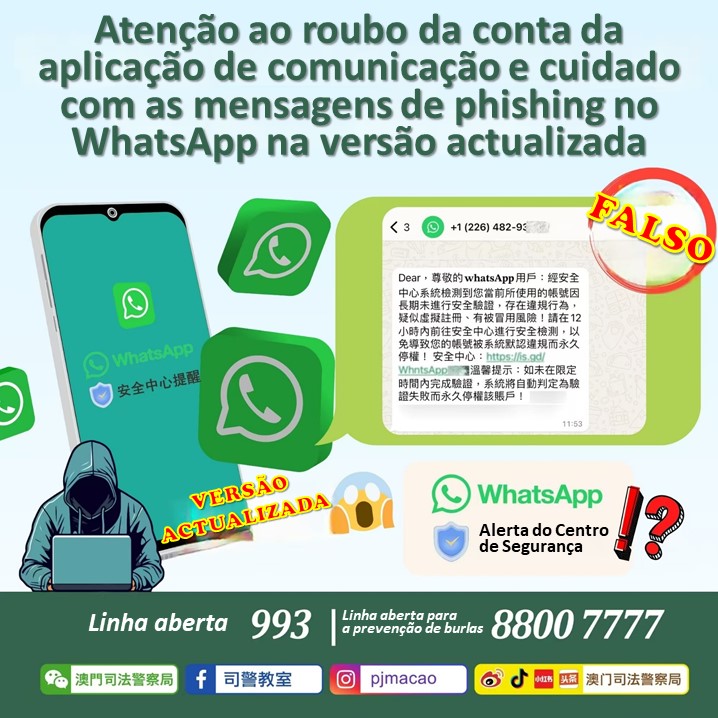 Recentemente, a Polícia Judiciária descobriu uma nova modalidade de roubo da conta de WhatsApp, que difere da anterior em que os burlões enviavam, de forma aleatória, um grande número de mensagens SMS. Nesta nova estratégia, os burlões começaram a enviar mensagens fraudulentas directamente através do WhatsApp, alegando que a conta da pessoa estava envolvida em irregularidades e seria bloqueada, pedindo que a pessoa clicasse de imediato no link (phishing) incluído na mensagem para finalizar a verificação”. Quando o utilizador clica, é encaminhado para outro contacto do WhatsApp utilizado pelo burlão, que fornece um código de seis dígitos, solicitando que a pessoa introduza esse código na aplicação do WhatsApp do seu telemóvel. Se a vítima seguir as instruções e inserir o código referido, sua conta será imediatamente acessada pelos burlões noutro local. Após obter acesso àquela conta de WhatsApp, os burlões irão utilizá-la para enganar amigos e familiares ou para outros fins ilícitos.