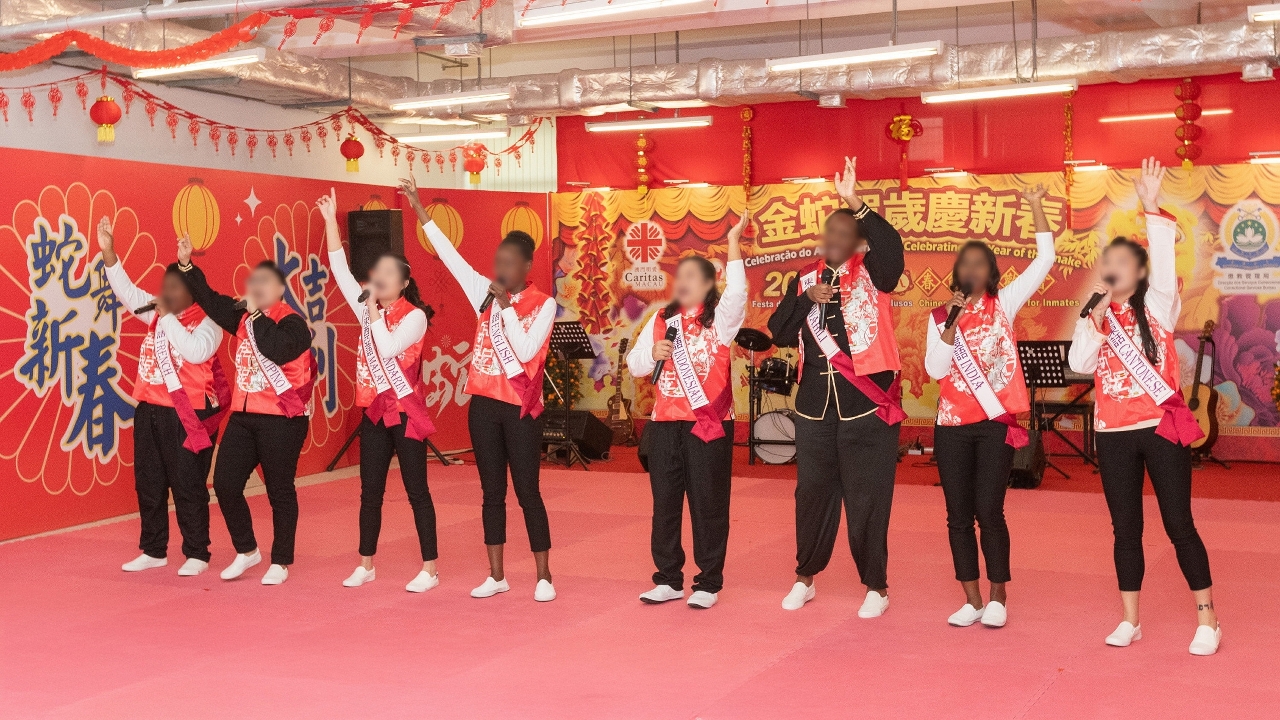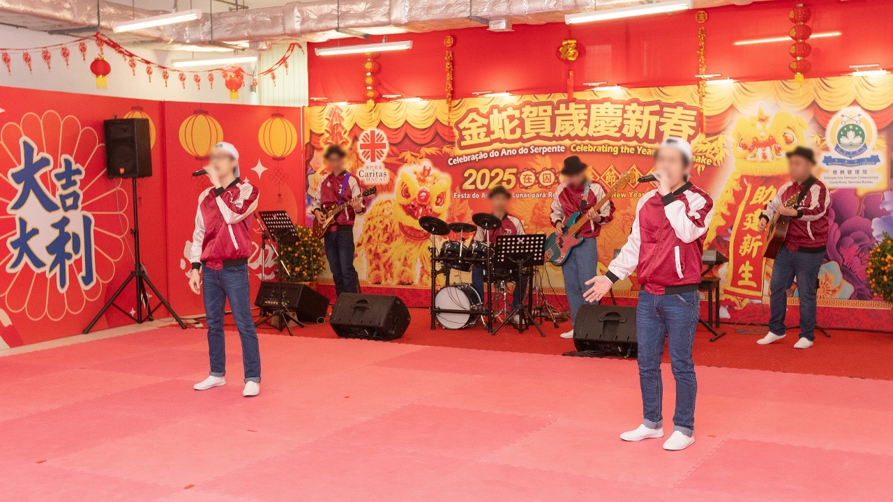 Na manhã do dia 15 de Janeiro, participaram na primeira sessão da festa os representantes convidados de vários órgãos do governo e organizações de serviço social e presidiram à cerimónia de vivificação de leões o Secretário para a Segurança, Wong Sio Chak, o Director da DSC, Cheng Fong Meng, e o Secretário-geral da Cáritas de Macau, Pun Chi Meng. Com o som dos gongos e tambores, deu-se início oficialmente à Festa do Ano Novo Lunar. Na festa, os reclusos fizeram sucessivamente diversas apresentações, incluindo dança do leão, coro multilingue, dança de bandeiras, artes marciais chinesas, dança do guarda-chuva e interpretação de canções originais. As apresentações ricas e vibrantes mostraram plenamente os talentos dos reclusos, recebendo aplausos entusiásticos de todos. Por fim, a festa terminou de forma memorável com um emocionante coro em conjunto.