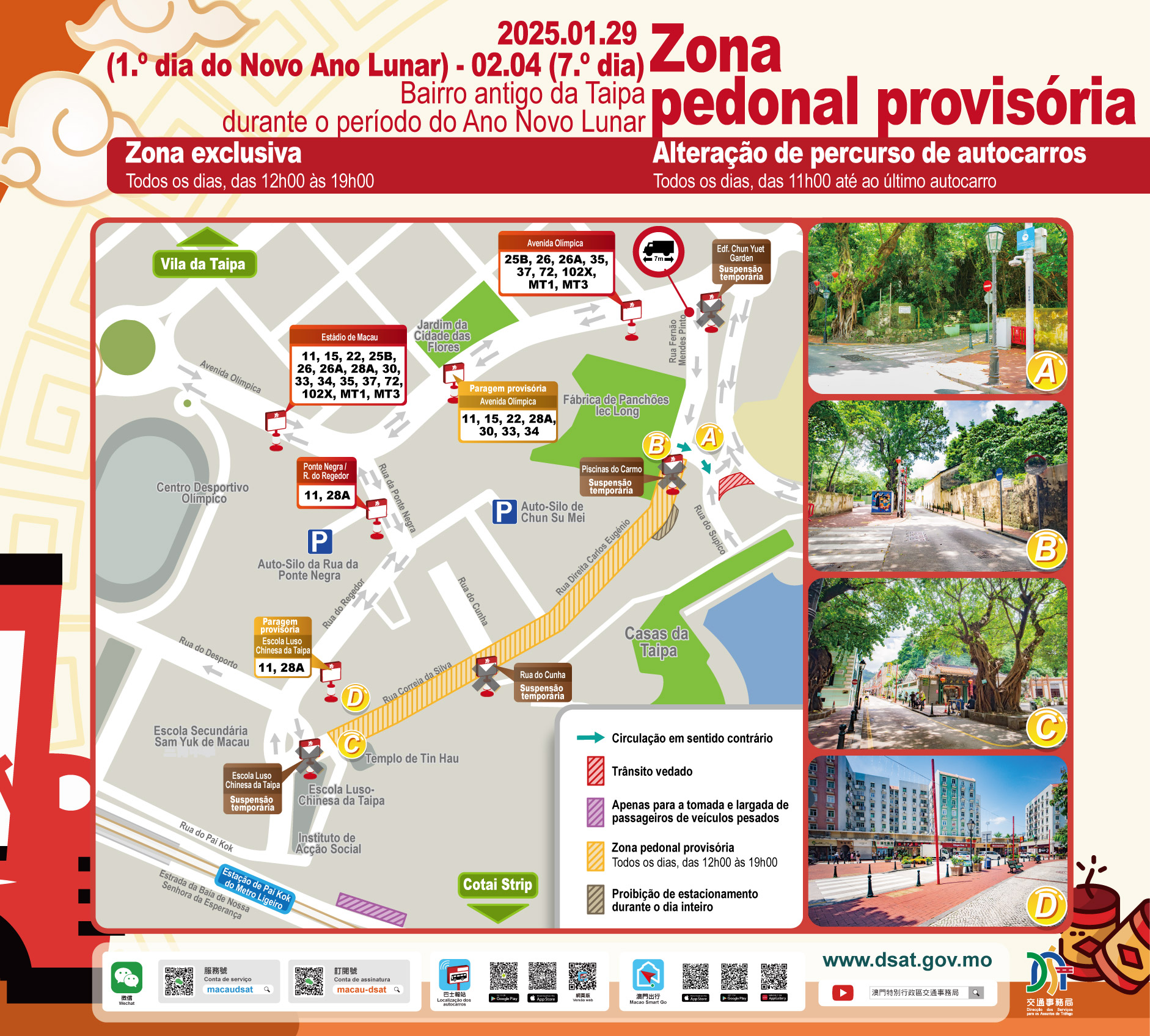 Durante o período do Ano Novo Lunar, para além do bairro antigo da Taipa, serão implementadas várias medidas provisórias de trânsito nos postos fronteiriços terrestres, na Avenida de Almeida Ribeiro e nas zonas envolventes, em paralelo, haverá ajustes nos serviços de autocarros públicos e do Metro Ligeiro devido à realização de actividades festivas de grande envergadura. Para mais detalhes, podem consultar a página electrónica da DSAT (https://), ou obter as informações mais recentes sobre o trânsito através das aplicações móveis “Macao Smart Go” e “Localização dos autocarros”, e da conta oficial de Wechat.