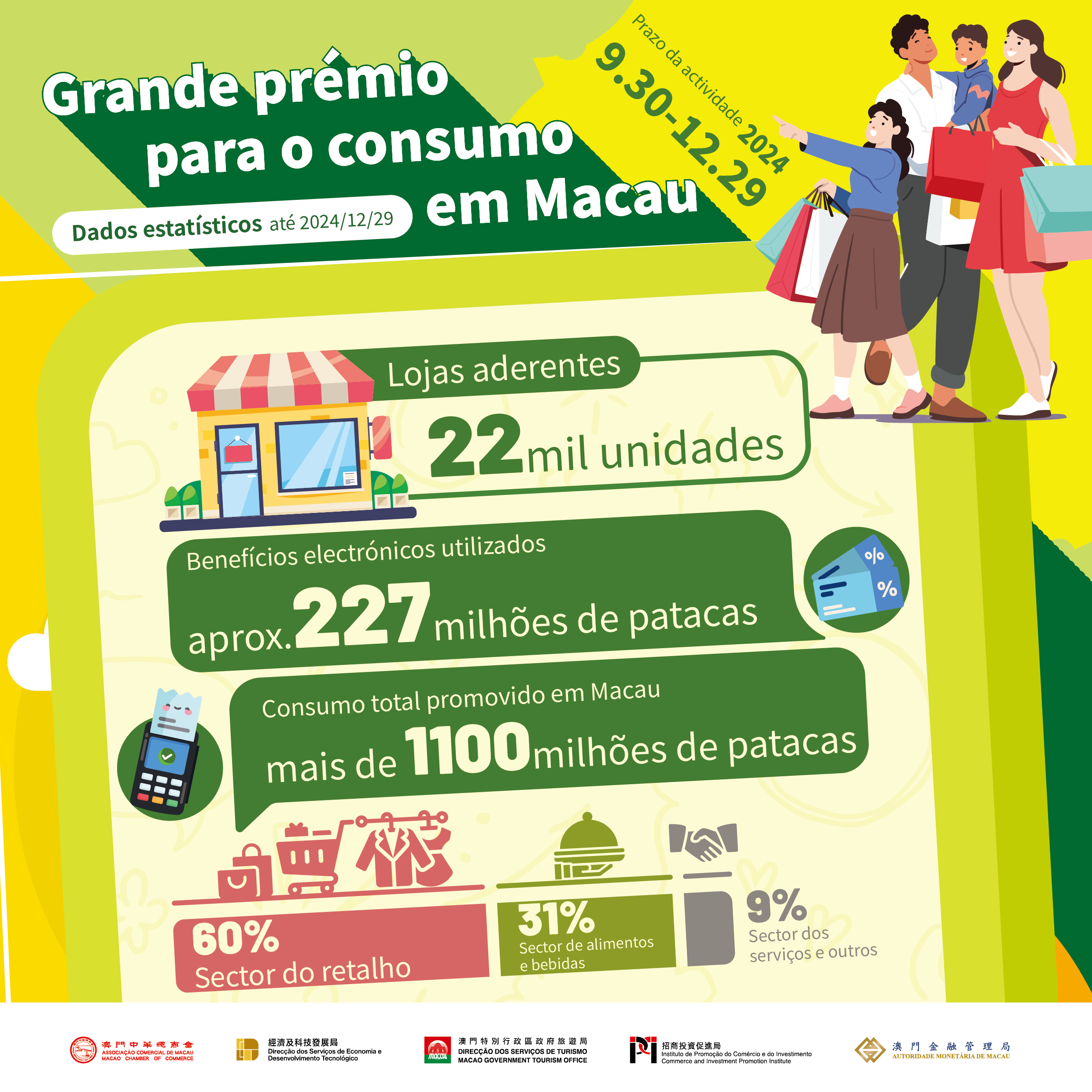 Esta actividade contou com cerca de 22 mil lojas aderentes, com a utilização de benefícios electrónicos no valor total de cerca de 227 milhões de patacas e o consumo total de mais de 1,1 mil milhões de patacas em Macau. Os estabelecimentos comerciais beneficiados são provenientes de diversos sectores de Macau, entre os quais, cerca de 60% do sector de comércio a retalho, cerca de 31% do sector de restauração e cerca de 9% do sector de serviços e de outros sectores. No decurso da realização desta actividade, 559 estabelecimentos comerciais ofereceram, em simultâneo, ofertas adicionais de consumo, impulsionando, em conjunto, o consumo nos bairros comunitários.