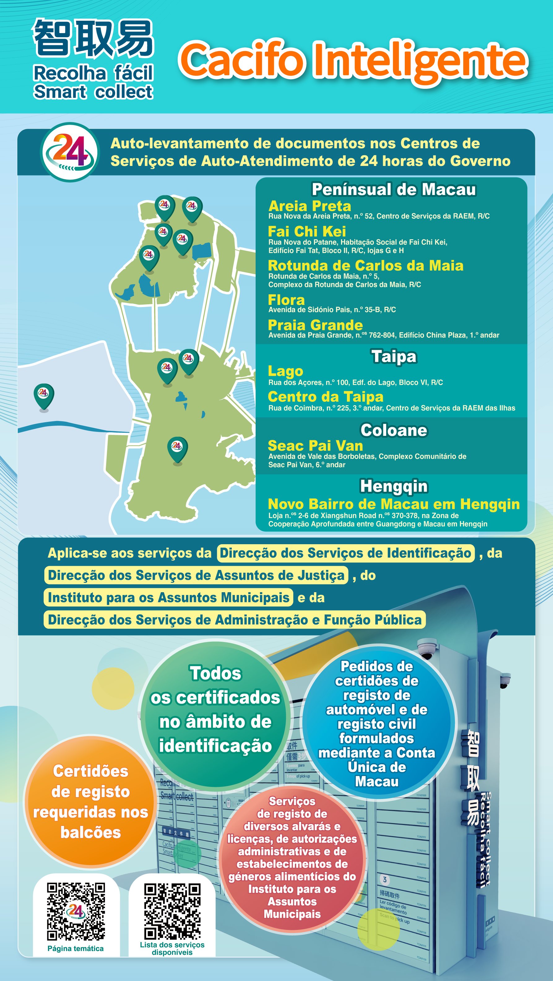 Em Junho de 2024, o Governo da RAEM lançou a “Recolha fácil” - cacifo inteligente, permitindo aos cidadãos, empresas e associações que requerem os serviços públicos designados, optar por levantar os documentos nos cacifos inteligentes instalados em Centros de Serviços de Auto-Atendimento de 24 horas do Governo, sem a restrição imposta pelo horário de expediente dos serviços públicos. Desde que foi lançado o serviço “Recolha fácil”- cacifo inteligente, já se registaram cerca de 10 mil marcações para os cacifos inteligentes, aumentando a conveniência dos cidadãos no levantamento de documentos de serviços públicos. Com o objectivo de melhorar ainda mais o âmbito do uso dos cacifos inteligentes, O Governo da RAEM já estendeu o serviço de "Recolha fácil" à Zona de Cooperação Aprofundada em Hengqin, e a partir de hoje (12 de Fevereiro), estarão instalados cacifos inteligentes nos Centros de Serviços de Auto-Atendimento na Rotunda de Carlos da Maia e na Flora, disponibilizando, o serviço de levantamento de documentos em todos Centros de Serviços de Auto-Atendimento de 24 horas do Governo em Macau.