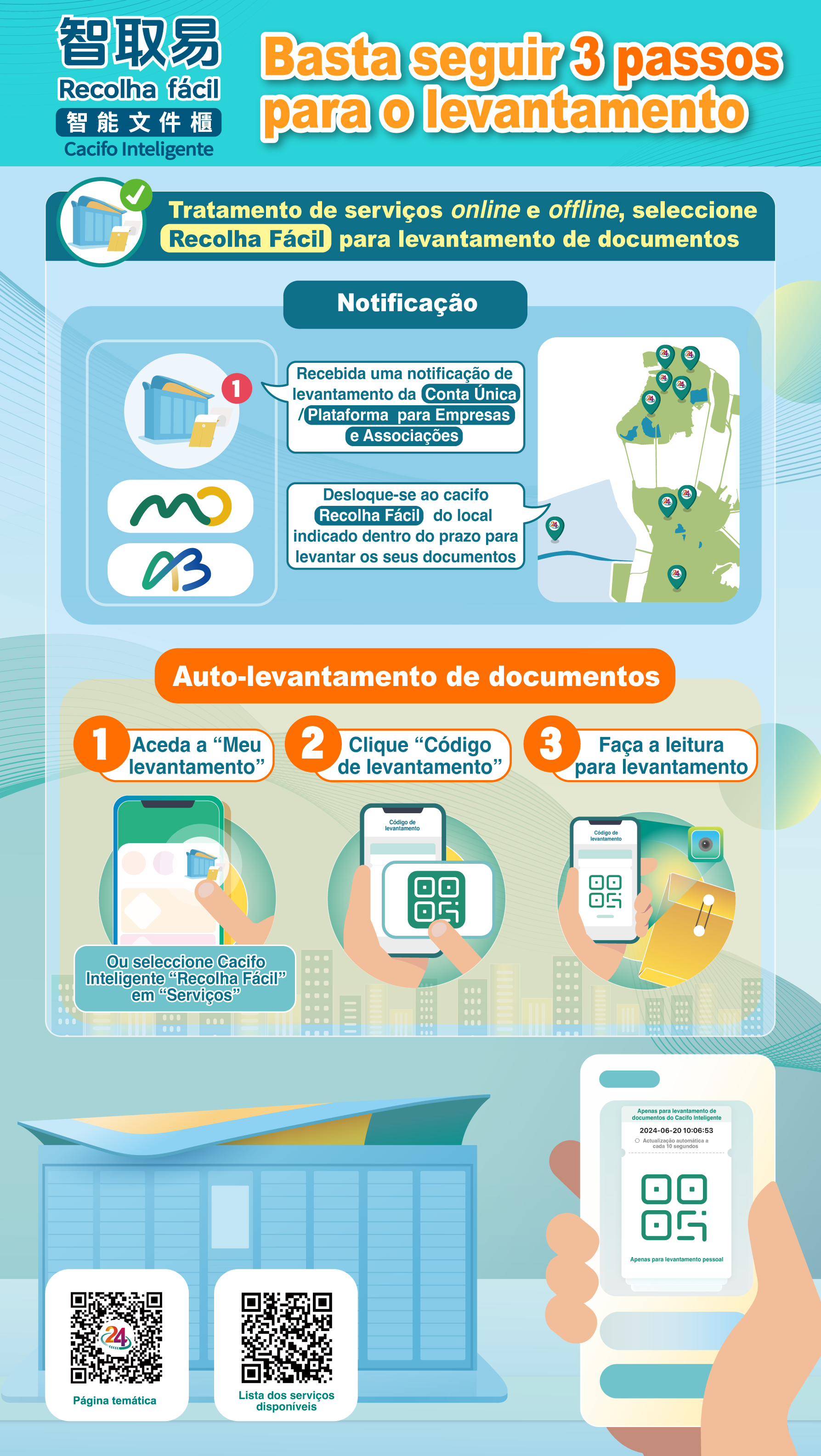Com o alargamento de serviços na “Conta Única” e na “Plataforma para Empresa e Associações”, muitos serviços já podem ser tratados online e os cidadãos podem obter as respectivas certidões electrónicas, contudo ainda se verifica uma certa procura, por parte dos cidadãos, de documentos comprovativos físicos emitidos por entidades públicas, deste modo, no sentido de proporcionar maior conveniência ao público e aumentar a eficiência, é lançado o serviço de cacifo “Recolha fácil”, integrando os procedimentos de serviços online e offline, podendo os cidadãos escolher, com flexbilidade, o local e o tempo de levantamento de documentos.