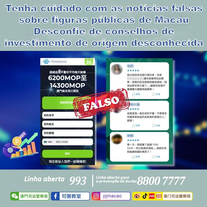 A PJ descobriu que, recentemente, os burlões têm vindo a divulgar uma grande quantidade de anúncios em plataformas de redes sociais, falseando notícias de entrevistas com figuras públicas de Macau. Nessas “notícias” afirmam que as figuras mencionadas declararam que é possível obter lucros substanciais por meio de certas plataformas de investimento, induzindo os cidadãos a clicar em links que os levam a plataformas de investimento falsas para registar contas. Os burlões utilizam essa táctica, aproveitando a oportunidade para roubar dados pessoais e defraudar os cidadãos.