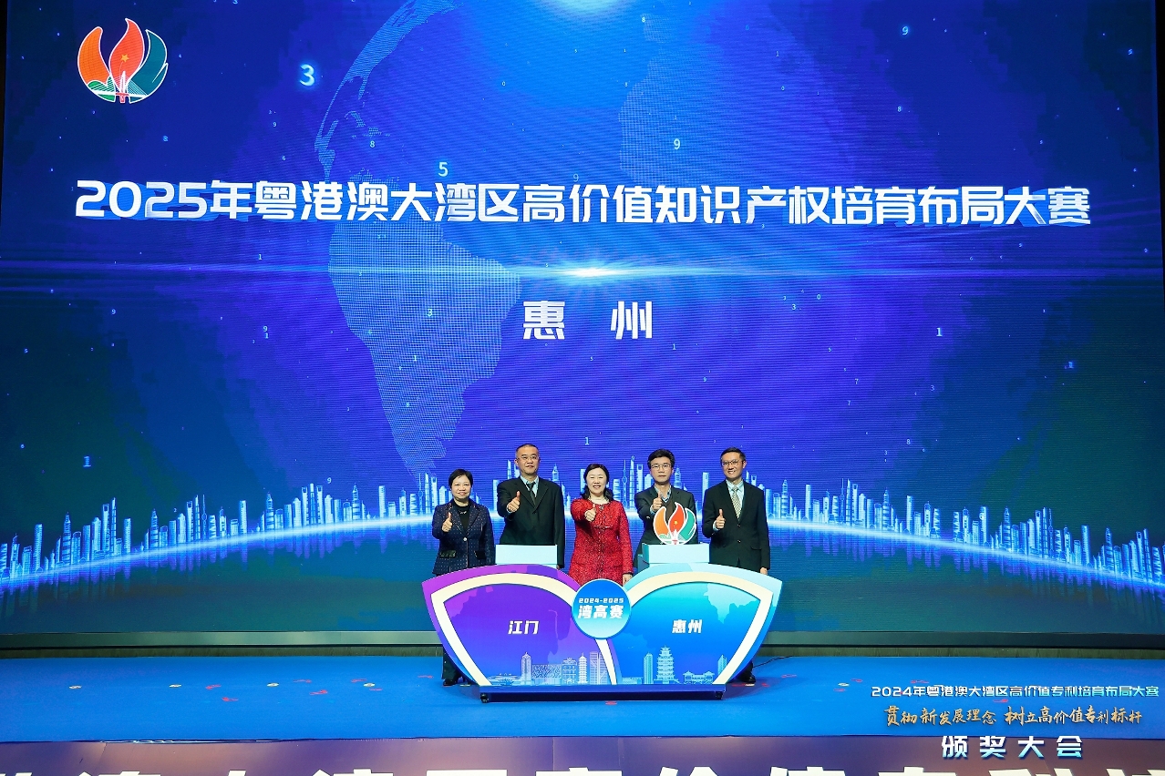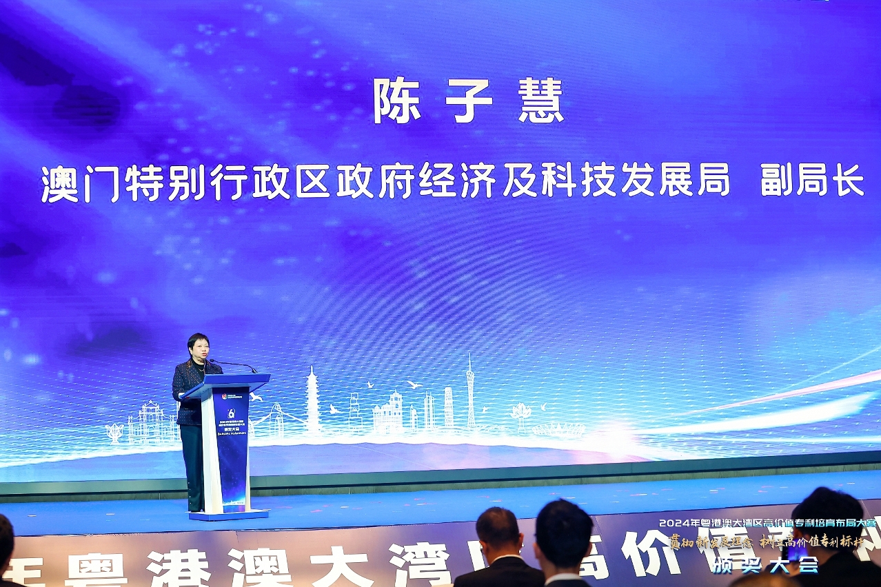 A cerimónia de entrega de prémios do Concurso para o Esquema da Formação de Patentes de Alto Valor da Grande Baía Guangdong-Hong Kong-Macau 2024 (Concurso) teve lugar na cidade de Jiangmen, a 25 de Fevereiro. Estiveram presentes na cerimónia a Inspectora de 1.ª classe da Administração de Regulação do Mercado da Província de Guangdong (Direcção da Propriedade Intelectual), Xie Hong, o Vice-Presidente do Governo Popular do Município de Jiangmen, Cao Yang, o Adjunto do Chefe do Departamento da Propriedade Intelectual do Governo da RAEHK, Lau Kwok Keung, e a Subdirectora da Direcção dos Serviços de Economia e Desenvolvimento Tecnológico (DSEDT) do Governo da RAEM, Chan Tze Wai, que proferiram discursos.
