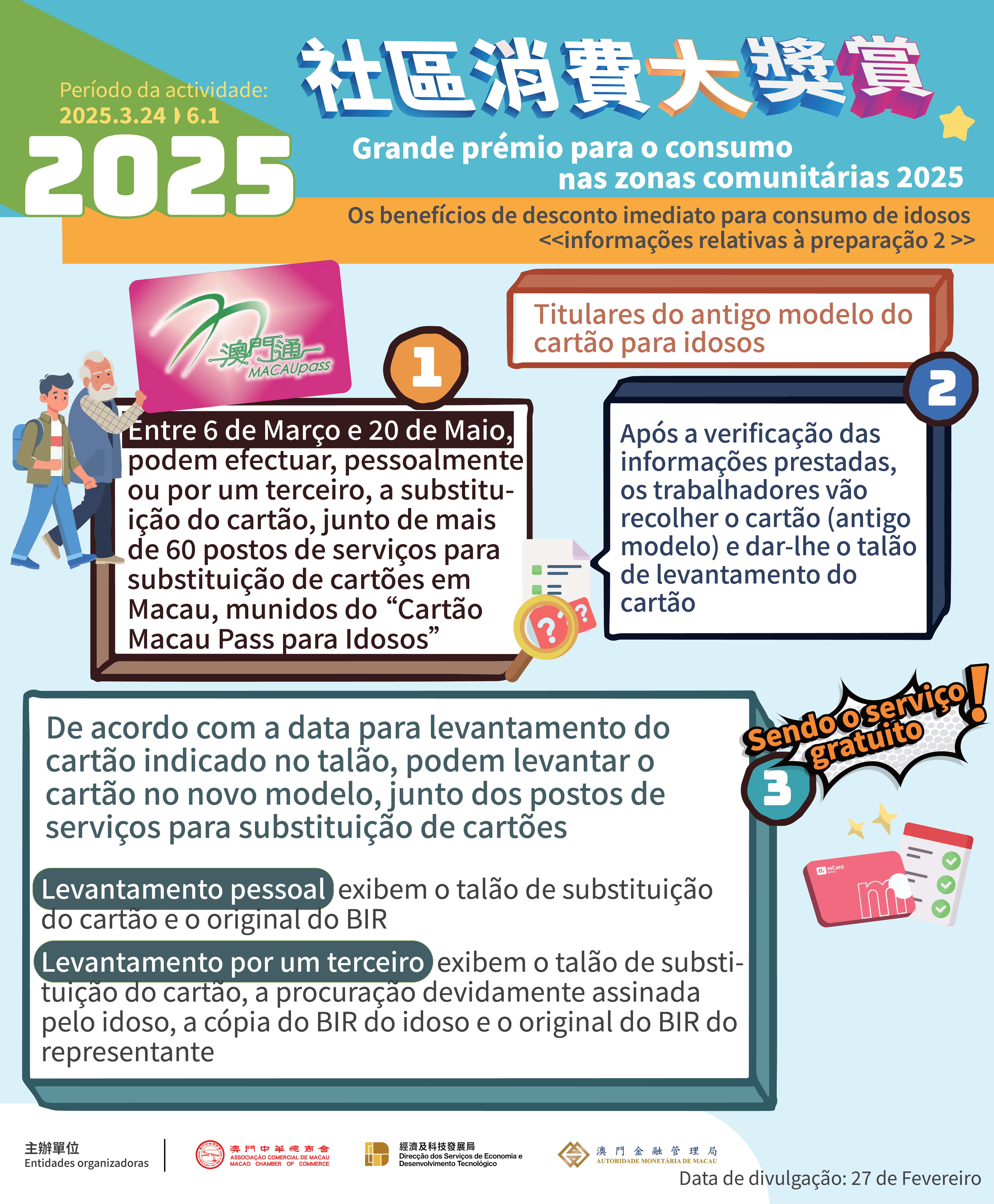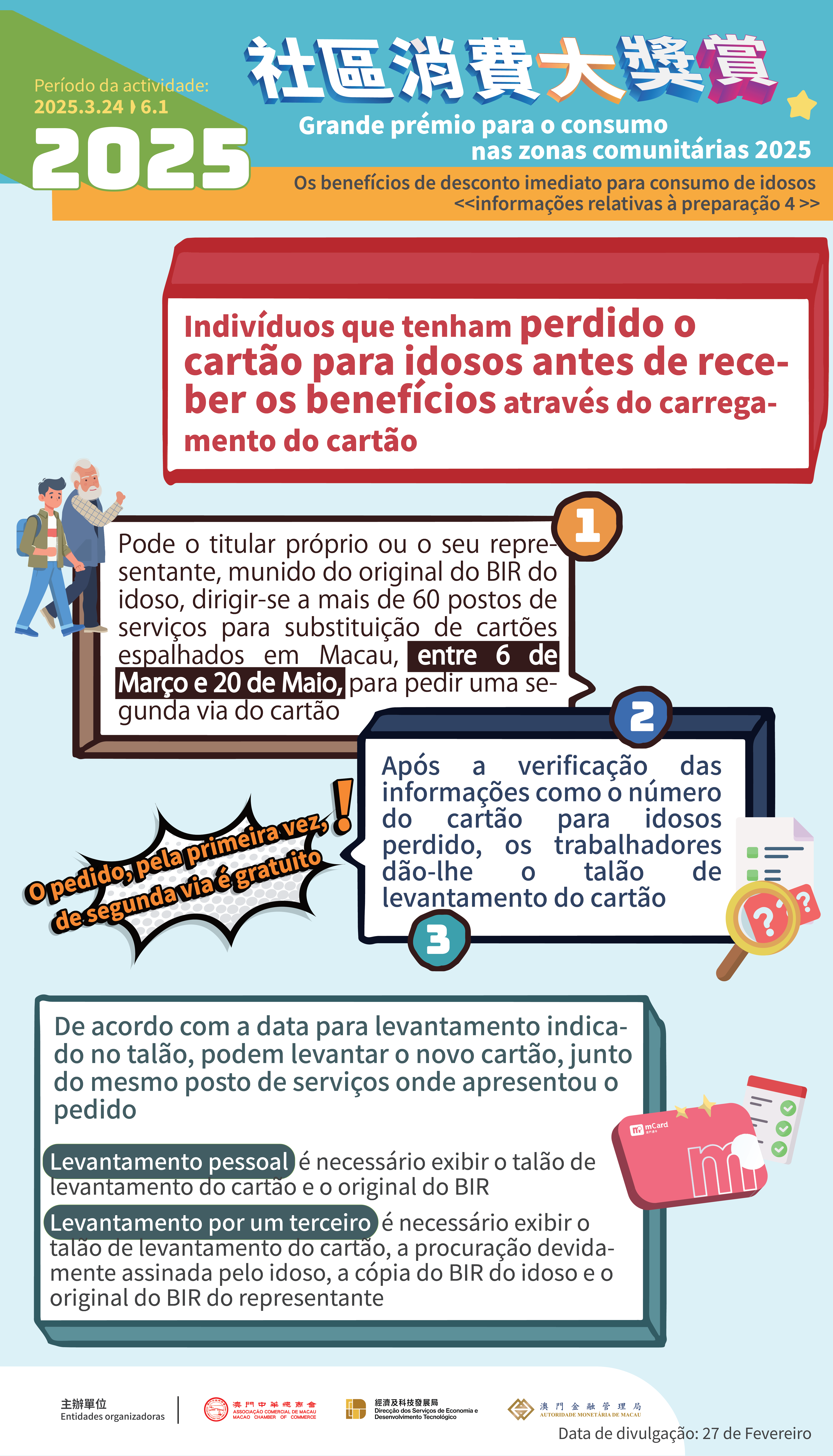 Para facilitar aos idosos a compreensão dos procedimentos de preparação para obter o “desconto imediato para consumo de idosos”, a DSEDT elaborou uma série de infografias, incluindo os procedimentos para diferentes cenários, tais como a substituição do cartão antigo por um novo, 2.ª via por extravio, o pedido o cartão pela primeira vez e o levantamento do cartão novo, etc.