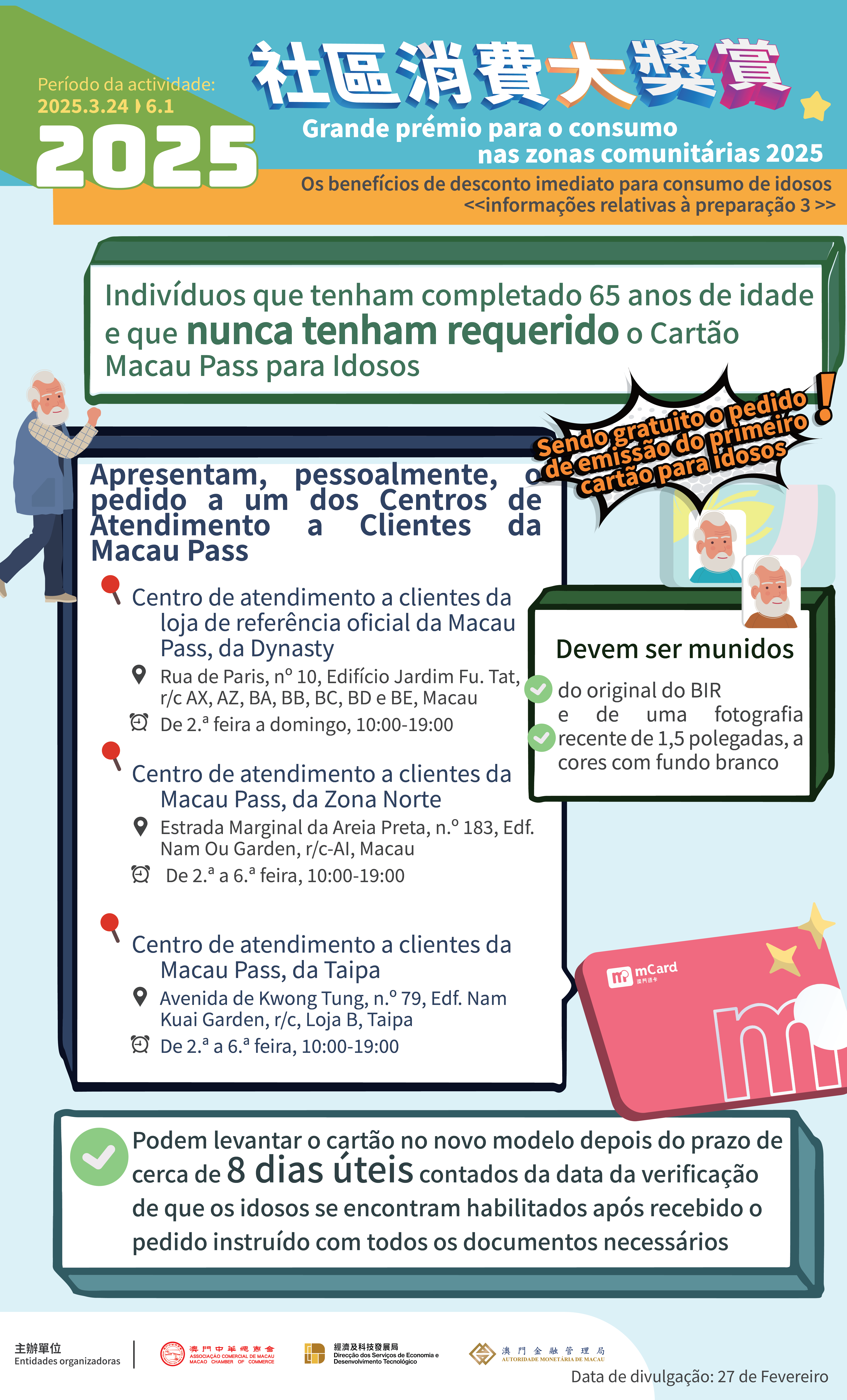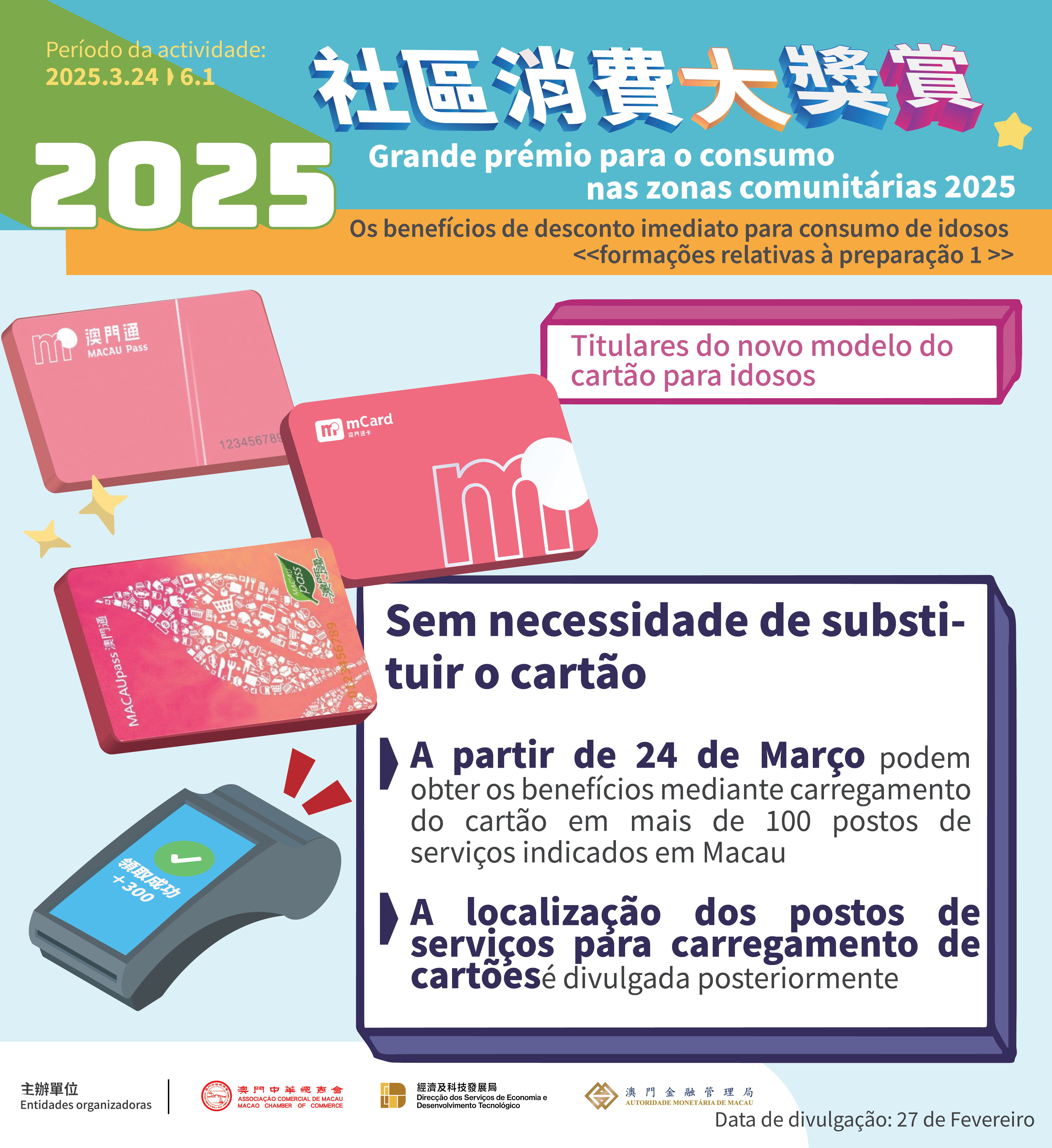 Os portadores da versão nova do “Cartão da Macau Pass para Idosos”, podem obter os benefícios de desconto imediato mediante carregamento do cartão em mais de 100 postos de serviços indicados instalados em Macau a partir do dia 24 de Março. Os pormenores relativos aos postos de serviço serão publicados posteriormente.