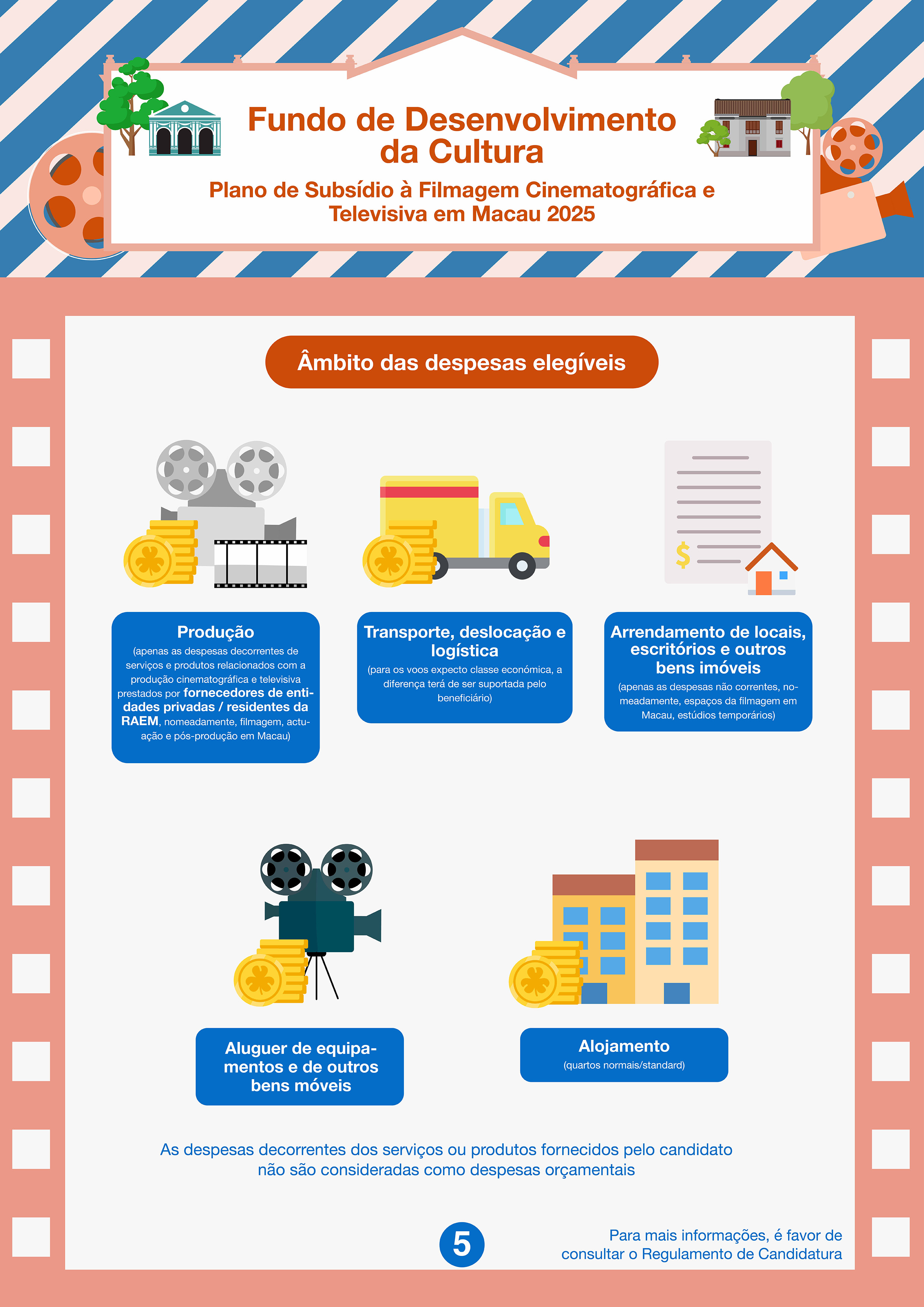 O Fundo de Desenvolvimento da Cultura (FDC) continua a lançar o “Plano de Subsídio à Filmagem Cinematográfica e Televisiva em Macau”, visando incentivar equipas do exterior para a filmagem em Macau, promovendo a imagem de Macau e aumentando o prestígio internacional da RAEM através de obras cinematográficas e televisivas, de modo a impulsionar a sinergia da criatividade cultural e do turismo, bem como promover o desenvolvimento da indústria cinematográfica e televisiva de Macau.