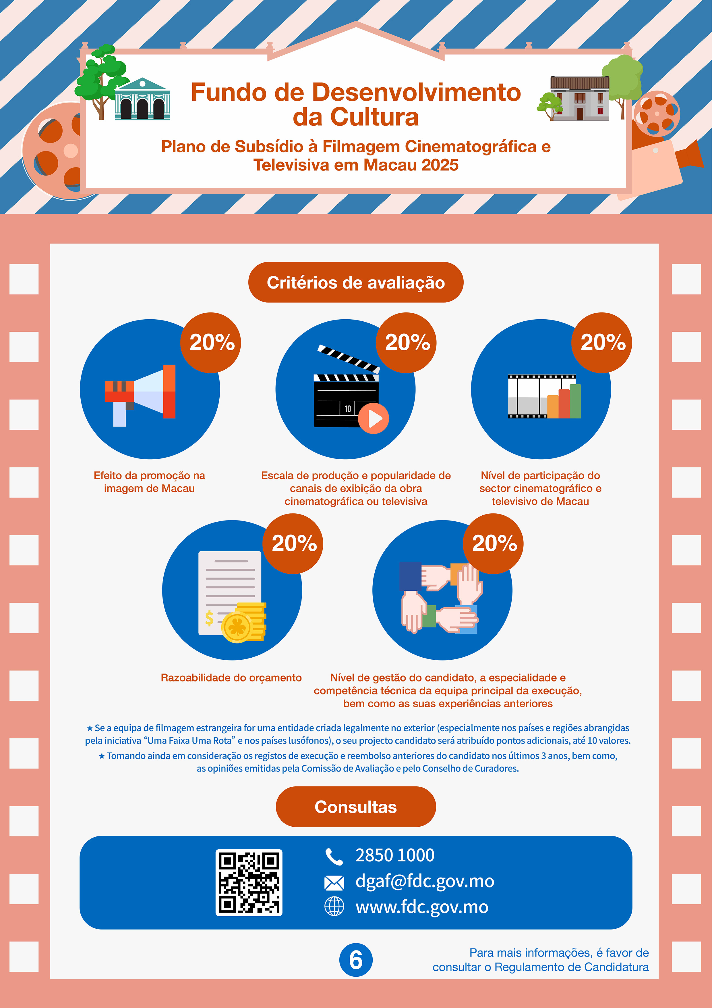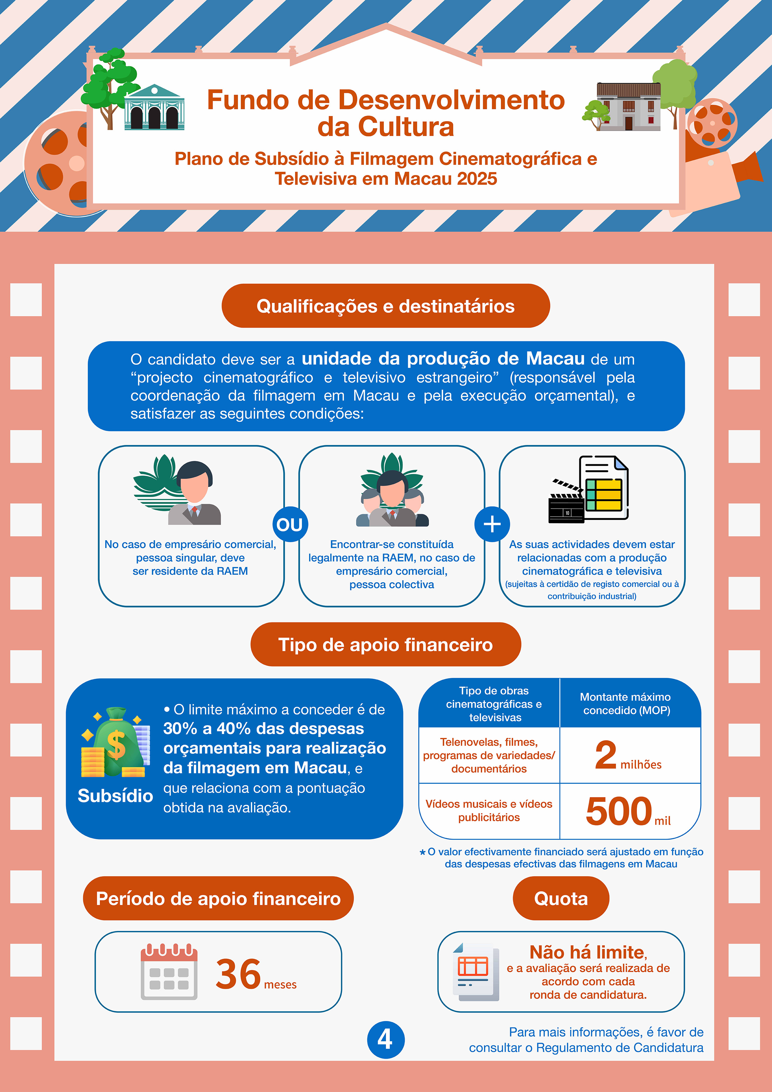 A modalidade do apoio financeiro deste Plano é por subsídios, e o limite máximo a conceder é de 30% a 40% das despesas orçamentais para realização da filmagem em Macau, com o montante máximo de MOP 500 mil ou MOP 2 milhões, de acordo com o tipo de obras cinematográficas e televisivas. A avaliação será feita tendo em conta efeito da promoção na imagem de Macau pelo projecto candidato, escala de produção e popularidade de canais de exibição da obra cinematográfica ou televisiva, nível de participação do sector cinematográfico e televisivo de Macau etc. Se a equipa de filmagem estrangeira for uma entidade criada legalmente no exterior (especialmente nos países e regiões abrangidas pela iniciativa “Uma Faixa Uma Rota” e nos países lusófonos), o seu projecto candidato será atribuído pontos adicionais.