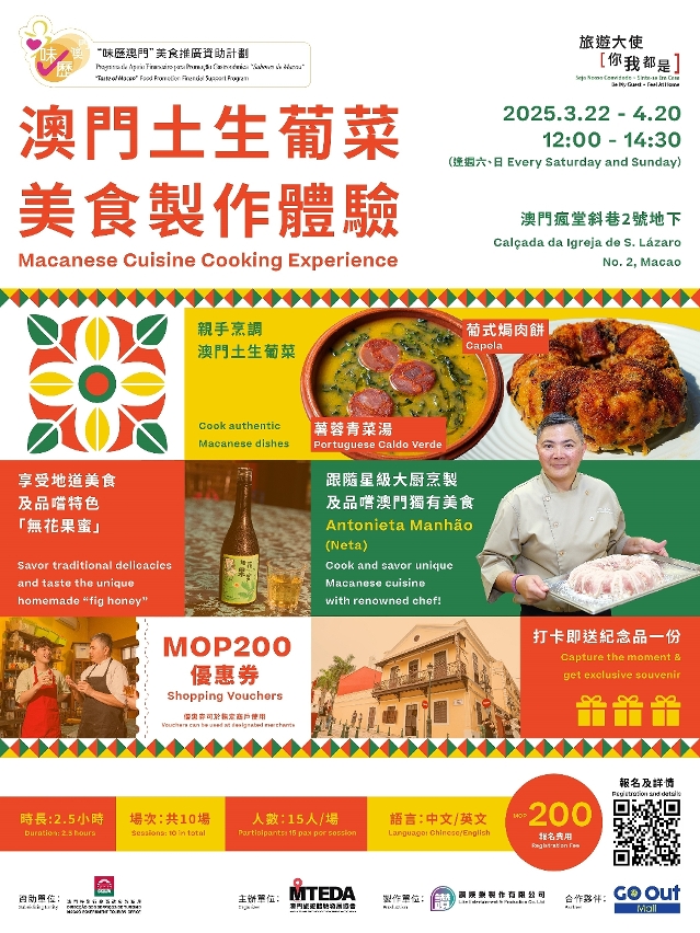 Antonieta Manhão (Neta), chef macaense premiada, conduzirá todos os sábados e domingos entre 22 de Março e 20 de Abril uma exploração pela essência da culinária macaense. A chef ensinará os segredos de confecção de pratos autênticos e partilhará histórias sobre as suas gentes, para dar a sentir aos residentes e visitantes a singularidade da história do cruzamento de culturas gastronómicas entre a China e Portugal de Macau.