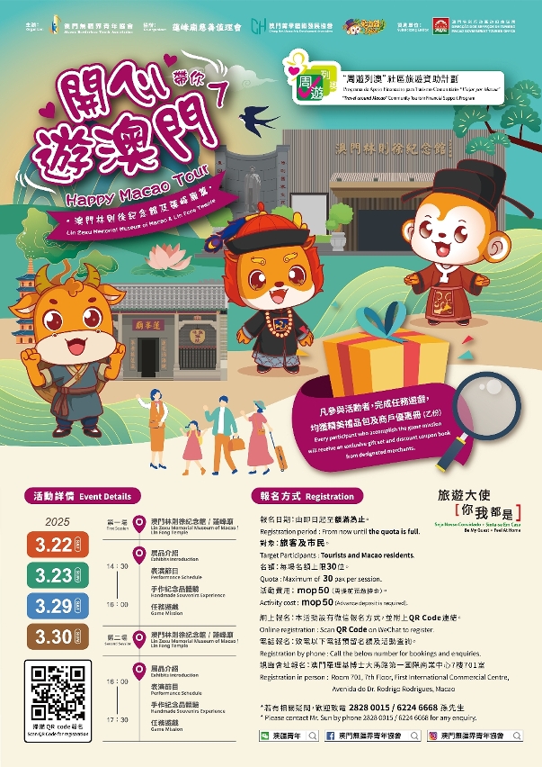 Nos dias 22 e 23, e 29 e 30 de Março, mascotes vão acompanhar os participantes em passeios pelo Museu Memorial Lin Zexu de Macau e pelo Templo de Lin Fong, com apresentação sobre os artigos em exibição, jogos interactivos, experiência de realização de lembranças artesanais e espectáculos de animação para proporcionar aos residentes e visitantes um programa de fim-de-semana animado.