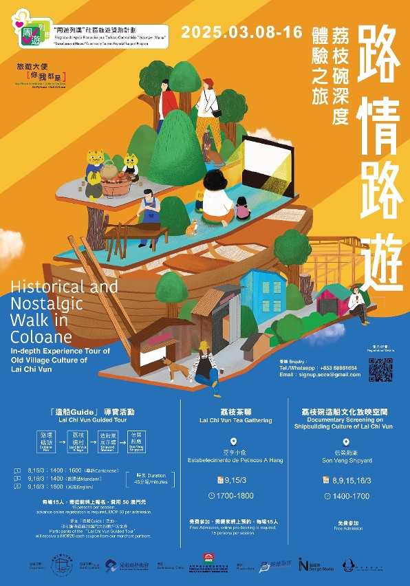 Os passeios “Historical and Nostalgic Walk in Coloane” decorrem aos sábados e domingos entre 8 e 16 de Março. O programa dos passeios inclui três actividades: visita guiada com encontro de chá e exibição de documentário sobre a cultura de construção naval de Lai Chi Vun. A visita guiada convida os participantes a entrar na Lai Chi Vun de outros tempos, influenciada pela cultura de construção de embarcações, para conhecer histórias do século passado sobre a arte de construção naval de Macau, e ainda beber um chá e saborear as mudanças, beleza e simplicidade desta zona. Os passeios guiados decorrerão cantonês, mandarim e inglês.