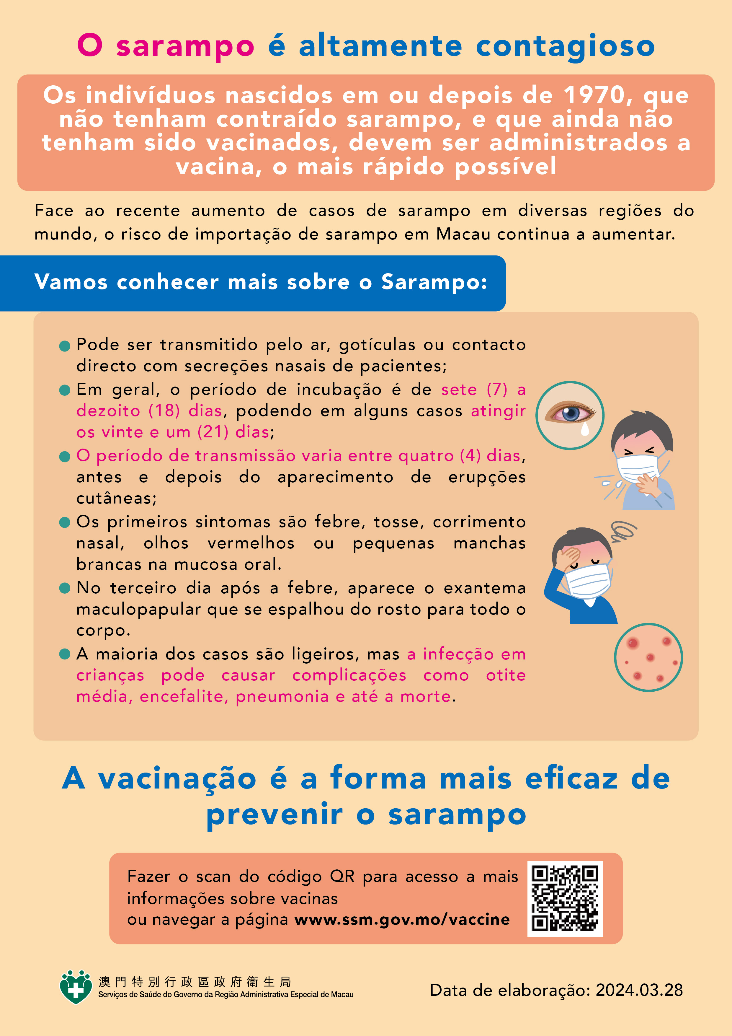 Os Serviços de Saúde continuam a monitorizar rigorosamente a situação epidemiológica do sarampo a nível mundial. Recentemente, vários estados dos Estados Unidos registaram surtos de sarampo, países como as Filipinas e o Vietname também têm registado um número crescente de casos de sarampo devido à baixa taxa de vacinação contra o sarampo. Actualmente, embora Macau não seja uma região com epidemia de sarampo, existe o risco de importação do sarampo. Os Serviços de Saúde apelam aos residentes que ainda não têm imunidade contra o sarampo, especialmente os que planeiam viajar para áreas afectadas, para assegurarem a conclusão da vacinação antes de viajarem.