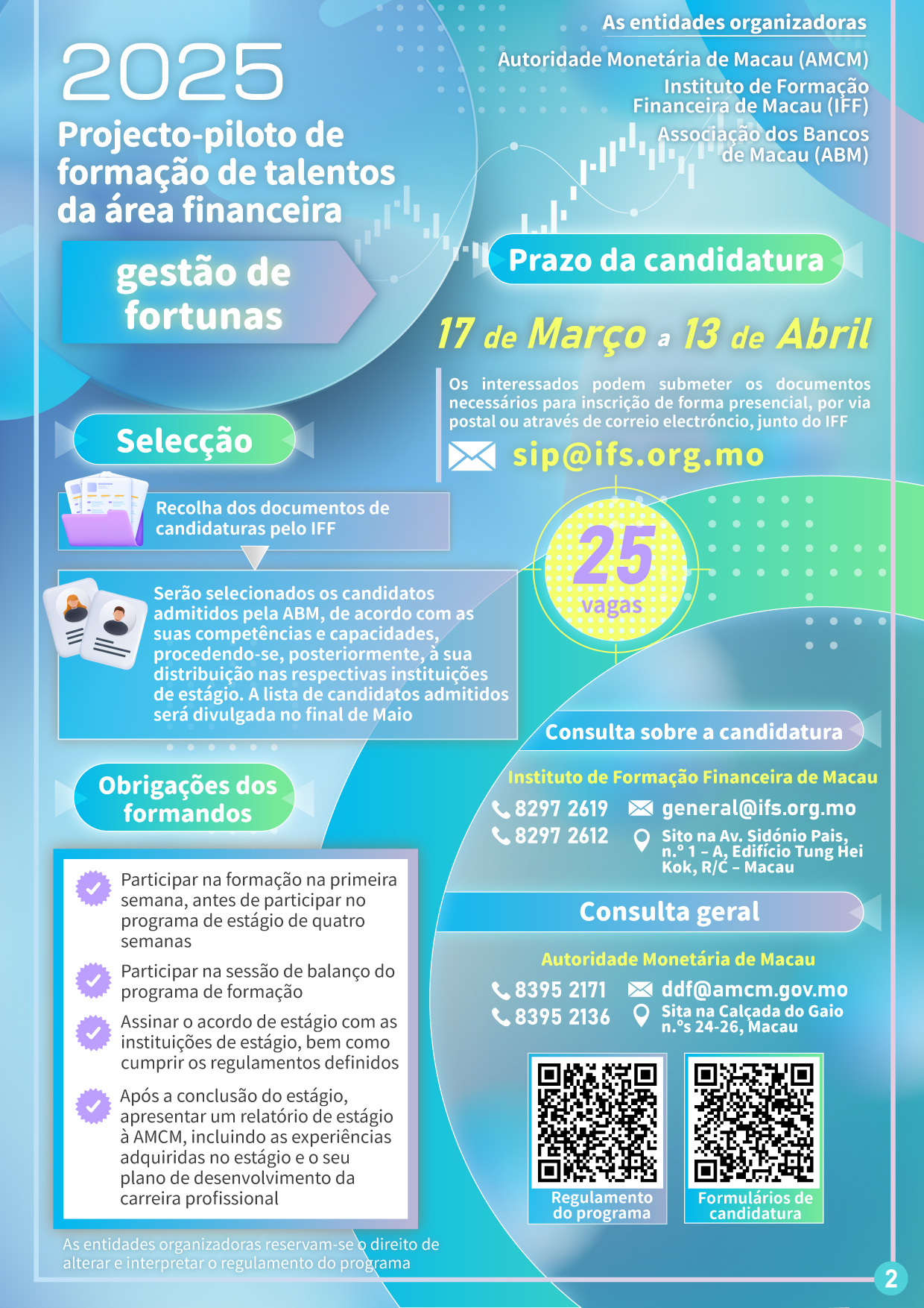 O prazo de candidatura decorre de hoje até 13 de Abril de 2025, sendo que os candidatos devem ser estudantes universitários que frequentam um curso de finanças ou cursos relevantes e estão interessados no trabalho relacionado com a actividade da gestão de fortunas, sendo também residentes de Macau com idade superior a 18 anos. Os interessados qualificados podem candidatar-se através do Instituto de Formação Financeira, no prazo da candidatura acima referida. Serão selecionados 25 candidatos para participar neste programa, sendo que a lista de candidatos admitidos será divulgada no final de Maio.