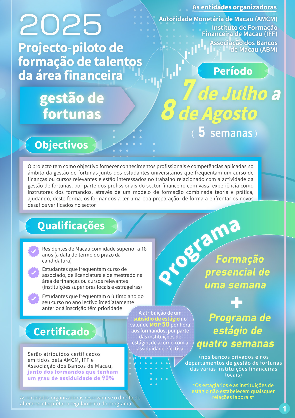 Com vista a coadunar com a estratégia de desenvolvimento da diversificação adequada da economia "1+4" do governo da RAEM, cultivar e reservar talentos profissionais necessários para novas áreas de actividades financeiras modernas, a Autoridade Monetária de Macau (AMCM) continua a lançar no verão do ano de 2025, em conjunto com o Instituto de Formação Financeira de Macau e a Associação de Bancos de Macau, o “Projecto-piloto de formação de talentos da área financeira – gestão de fortunas” (adiante designado por “projecto-piloto”), tendo como objectivo fornecer formação sistemática e direcionada, bem como oportunidades de estágio para estudantes interessados em seguir uma carreira em gestão de fortunas, permitindo assim melhorar a sua adaptabilidade e competitividade no trabalho, estando abertas as inscrições para o projecto-piloto a partir de hoje até 13 de Abril de 2025.