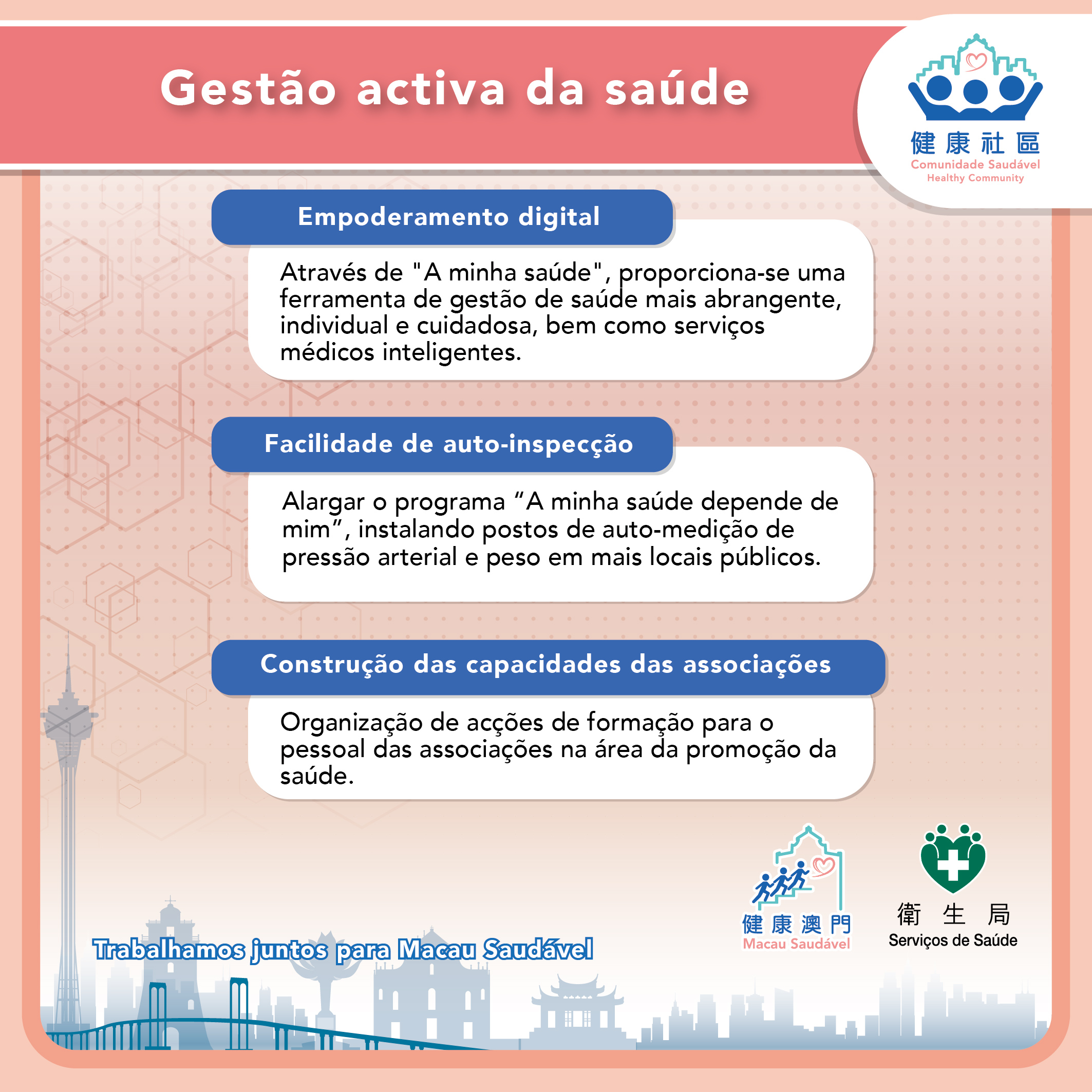 No discurso proferido na cerimónia de lançamento, o Director Lo Iek Long referiu que, desde o 18º Congresso Nacional do Partido Comunista da China, o País tem sempre colocado a “protecção da saúde da população” na posição estratégica de desenvolvimento prioritário, promovendo activamente a construção de uma “China saudável”. Do mesmo modo, o Governo da RAEM também atribui grande importância à saúde física e mental dos residentes. Actualmente, as doenças crónicas, tais como a hipertensão, a diabetes e os tumores, são os principais factores que afectam a saúde e a vida dos residentes de Macau. 70% das doenças crónicas podem, através de um estilo de vida saudável, apoiar um ambiente saudável, bem como medidas e políticas favoráveis à saúde para a prevenção e controlo. O Programa “Comunidade Saudável”, através da cooperação interdepartamental do Governo, articulará amplamente com as forças das associações e instituições dos diversos sectores, desenvolvendo sinergias e focando-se na promoção de comportamentos saudáveis e na gestão proactiva da saúde, em simultâneo, em estreita articulação com os programas existentes de “Empresas Saudáveis” e de “Escolas Saudáveis”, concretizaremos, em conjunto, os objectivos do “Plano de Acção para Macau Saudável”, a partir de três aspectos: A vida, o trabalho e a aprendizagem dos residentes, elevando o nível de saúde, a sensação de ganho e felicidade dos residentes, injectando uma nova vitalidade na “Macau Feliz”. O lançamento deste programa demonstra a determinação do Governo e dos diversos sectores da sociedade, especialmente das associações e instituições na criação conjunta de uma “Macau saudável”, abrindo um novo capítulo na concretização do “descentralizar recursos” no sistema de saúde de Macau.