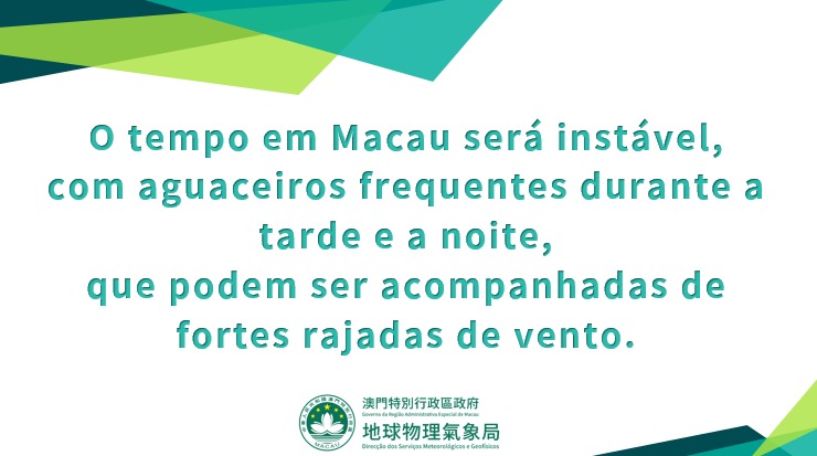 Uma frente fria está a mover-se para Sul em direção à costa de Guangdong. Prevê-se que os aguaceiros aumentem e sejam ocasionalmente fortes, acompanhados de trovoada e vento forte com rajadas, durante a tarde e noite deste Sábado. Com a influência da monção de nordeste subsequente, o vento do quadrante norte vai intensificar-se, e a temperatura mínima vai descer para cerca de 16 graus Celsius no domingo (dia 13). Prevê-se céu geralmente pouco nublado para os dias seguintes e uma grande diferença de temperatura entre o dia e a noite. Apela-se à população que preste atenção às alterações meteorológicas.