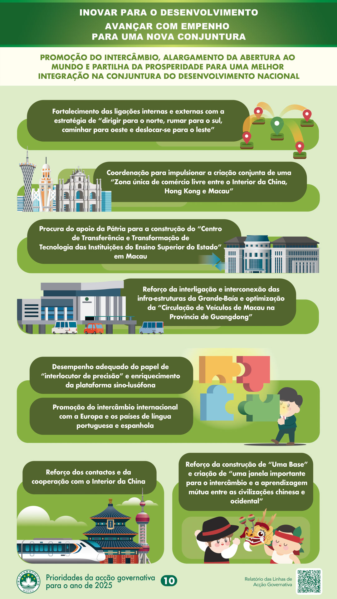 • 6. Promoção do intercâmbio, alargamento da abertura ao mundo e partilha da prosperidade para uma melhor integração na conjuntura do desenvolvimento nacional