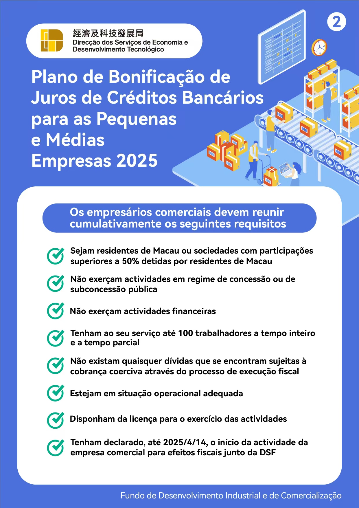 As pequenas e médias empresas qualificadas podem requerer a bonificação de juros de créditos através dos bancos, desde que obtenham, no período entre 22 de Abril de 2025 e 22 de Abril de 2026, o crédito autorizado por um banco licenciado em Macau destinado a financiar as necessidades de fundo de maneio da empresa candidata. O montante máximo dos créditos a conceder a cada empresário comercial é de cinco milhões de patacas, com o prazo máximo de bonificação de três anos e o limite máximo da taxa anual de bonificação é de 4%. O limite máximo do montante total dos créditos a bonificar é de 10 mil milhões de patacas.