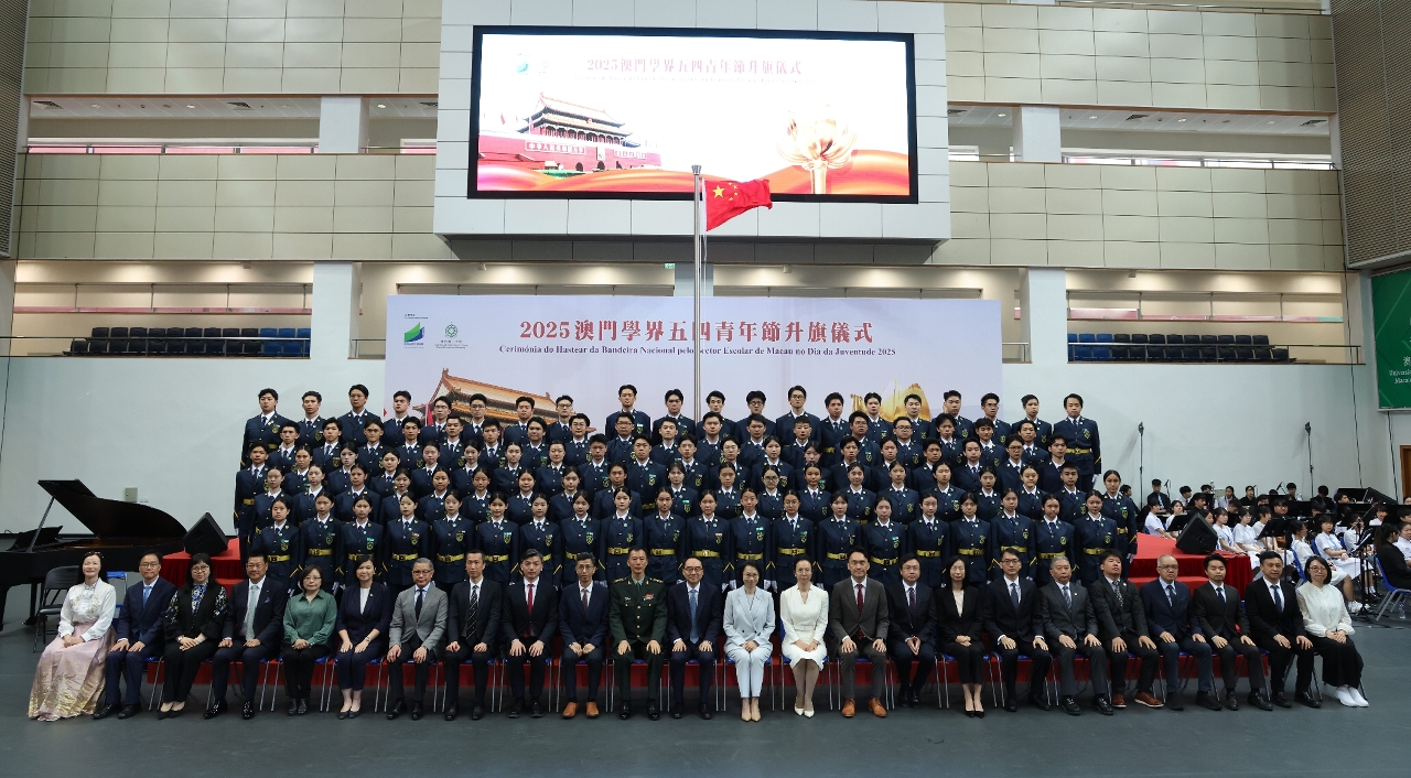 A “Cerimónia do Hastear da Bandeira Nacional pelo Sector Escolar de Macau no Dia da Juventude” teve lugar no dia 4 de Maio, pelas 7h45, no Pavilhão Polidesportivo da Universidade Politécnica de Macau, e contou com a presença dos seguintes elementos: Secretária para os Assuntos Sociais e Cultura, O Lam, Chefe do Departamento de Educação e Assuntos de Juventude do Gabinete de Ligação do Governo Popular Central na RAEM, Li Xuefei, Chefe do Gabinete de Estudos das Políticas do Comissariado do Ministério dos Negócios Estrangeiros da República Popular da China na RAEM, Conselheira Ma Naifang, Subchefe do Estado-Maior da Guarnição em Macau do Exército de Libertação do Povo Chinês, Coronel, Liu Huan, Director da DSEDJ, Kong Chi Meng, Subdirectores da DSEDJ, Teng Sio Hong, Iun Pui Iun e Wong Ka Ki, e os chefes e chefias funcionais da DSEDJ, bem como os representantes, respectivamente, da Associação de Educação de Macau, da Associação para a Promoção do Desenvolvimento do Ensino Superior de Macau, da Associação das Escolas Católicas de Macau e da Associação Educativa da Função Pública de Macau, os membros provenientes, respectivamente, do Conselho de Educação, do Conselho de Juventude e do Conselho Profissional do Pessoal Docente, e ainda os representantes das associações juvenis e os reitores, directores, docentes, estudantes e representantes do ensino superior de Macau e das escolas de ensino não superior.