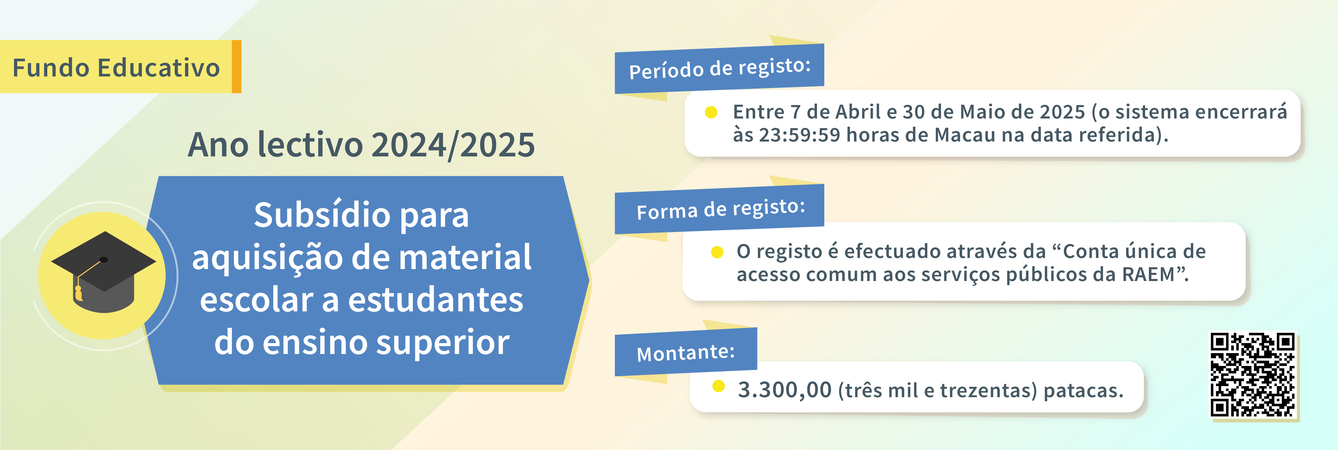 O registo para atribuição do subsídio para aquisição de material escolar a estudantes do ensino superior no ano lectivo de 2024/2025, do Fundo Educativo, terminará no dia 30 de Maio de 2025. Os estudantes do ensino superior que reúnam os requisitos poderão receber o referido subsídio, no valor de 3.300 patacas.