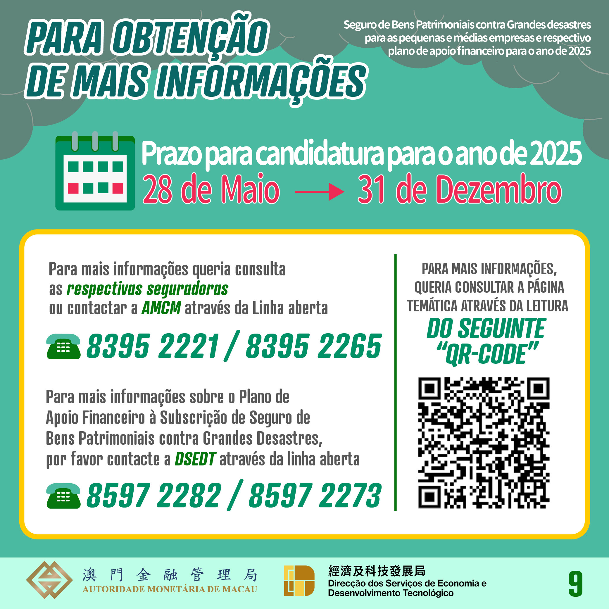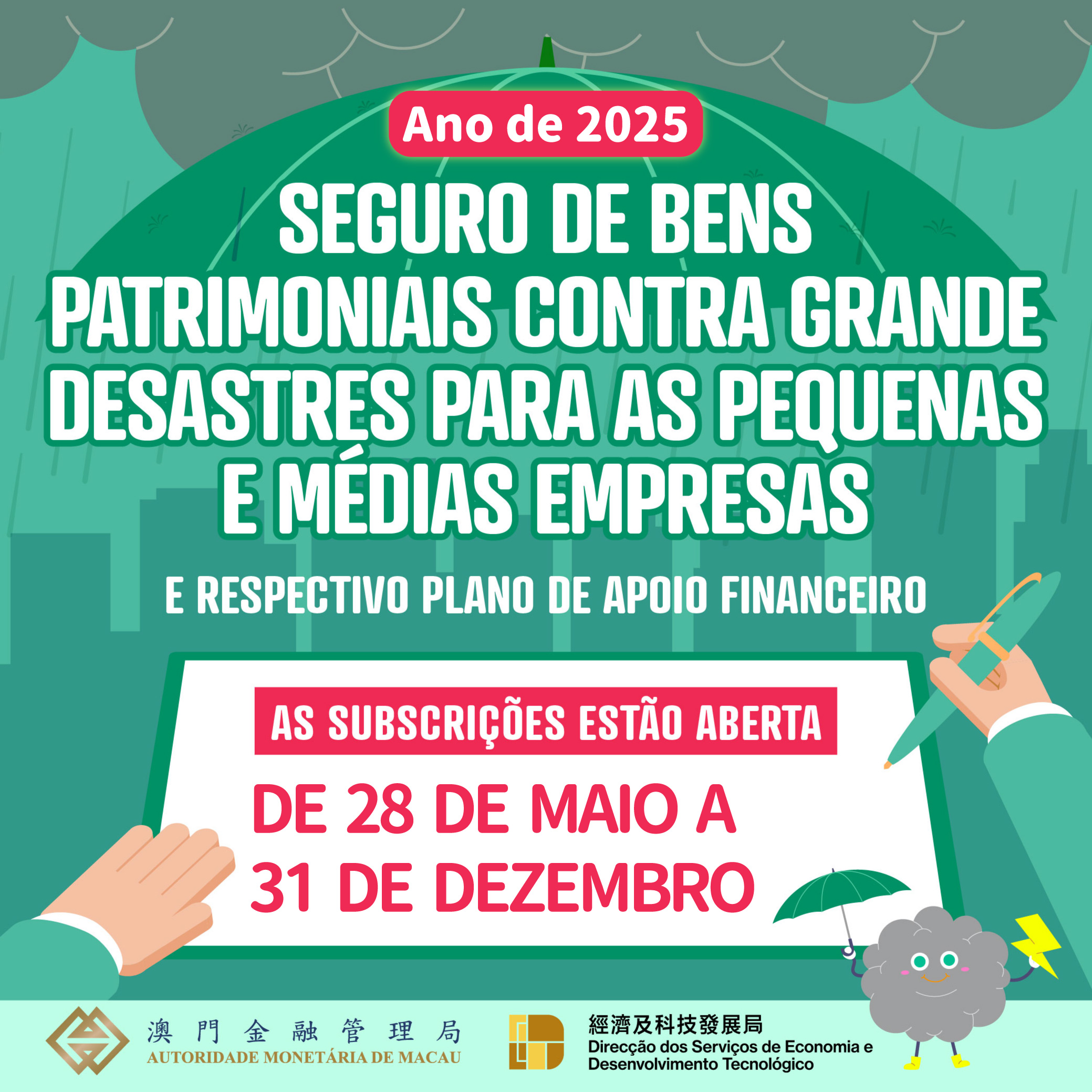 A subscrição do “Seguro de bens patrimoniais contra grandes desastres para as pequenas e médias empresas” para o ano de 2025 (adiante designado por “Seguro contra grandes desastres”) será aceite a partir de hoje até 31 de Dezembro do corrente ano, sendo que o Fundo de Desenvolvimento Industrial e de Comercialização continua a implementar medidas complementares como o “Plano de apoio financeiro a conceder no âmbito do seguro de bens patrimoniais contra grandes desastres para as pequenas e médias empresas” (adiante designado por “Plano de apoio financeiro”), no sentido de aliviar os encargos financeiros dos comerciantes.