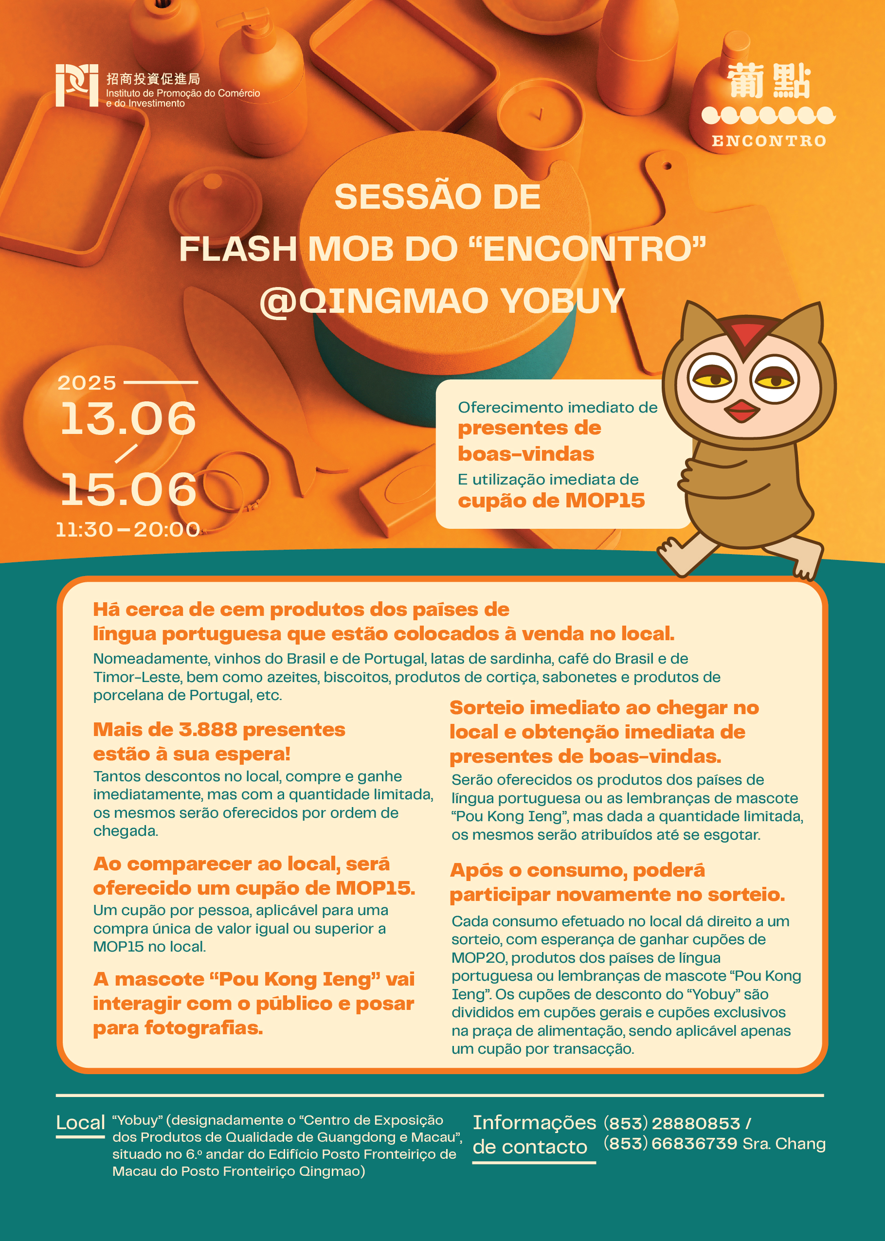 A Sessão de Flash Mob do “Encontro” @Qingmao YoBuy realiza-se hoje (dia 13) até ao dia 15, um evento promocional por iniciativa do Instituto de Promoção do Comércio e do Investimento (IPIM), no “Centro de Exposição dos Produtos de Qualidade de Guangdong e Macau” (doravante designado por “YoBuy”), situado no 6.º andar do Edifício do Posto Fronteiriço de Macau no Posto Fronteiriço Qingmao, no seguimento da sessão exclusiva de exposição e venda dos produtos de qualidade de Macau em Maio. Para além da loja Flash Mob do “Encontro”, o evento conta com a participação de12 empresas de Macau que representam produtos de países de língua portuguesa (PLP), trazendo para esse efeito mais de cem produtos. No local, será oferecida uma experiência de “três passos de desconto”, com mais de 3.888 prémios a serem distribuídos gratuitamente. Convidamos o público a visitar-nos entre sexta-feira e domingo, das 11h30 às 20h, para adquirir os seus produtos favoritos.