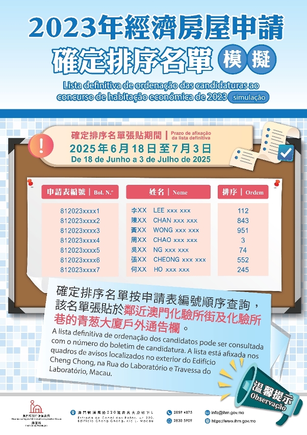 Para facilitar a consulta pelos candidatos, a lista provisória de ordenação foi feita por ordem do número dos boletins de candidatura, com a indicação dos nomes, em chinês e em português, e da ordenação dos candidatos, sendo referido na lista de exclusão os motivos de exclusão, por exemplo: o rendimento mensal ser inferior ou superior aos limites fixados pelo despacho do Chefe do Executivo; não apresentação dos documentos exigidos ou não suprimento da deficiência documental, no prazo fixado; o candidato e/ou os elementos do seu agregado familiar figurarem noutros boletins de candidatura do agregado familiar aos quais o IH tenha autorizado a aquisição de habitação económica.