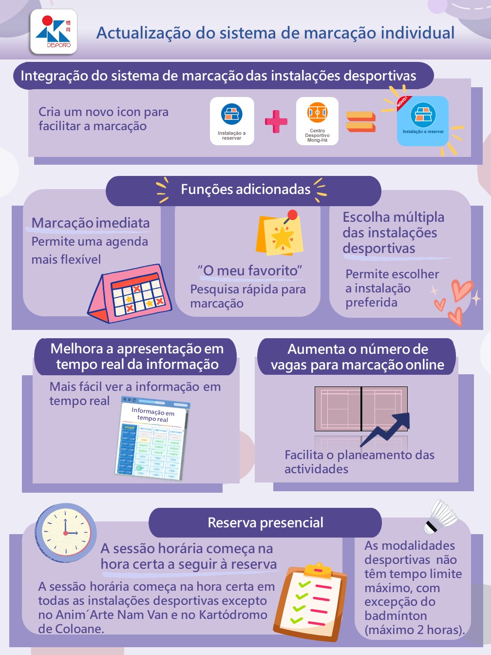 Com vista a melhorar a experiência dos cidadãos na utilização das instalações desportivas afectas ao Instituto do Desporto (ID), o ID procederá à actualização do sistema de marcação individual com interface e funções novas a partir de 20 de Junho de 2025, a fim de facilitar a marcação prévia das instalações desportivas. Em segundo lugar, o ID procede à optimização da reserva das instalações desportivas, incluindo acrescentar o serviço de marcação imediata online, a sessão horária começa na hora certa, aumentar a proporção do número de vagas para marcação e uniformizar o limite máximo das horas de reserva por cada dia das instalações desportivas, facilitando mais o planeamento das actividades.
