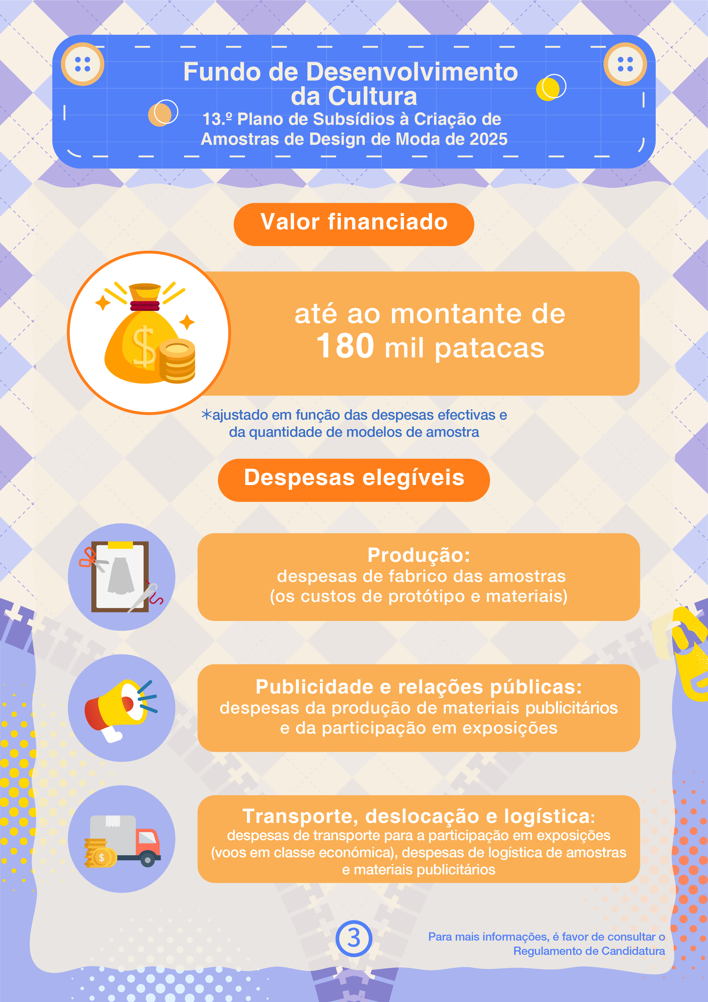 O Fundo de Desenvolvimento da Cultura (FDC) irá aceitar candidaturas, de 24 de Junho a 1 de Agosto, ao “13.º Plano de Subsídio à Criação de Amostras de Design de Moda”, com o objectivo de apoiar a produção de amostras e a promoção de colecções de moda originais de designers locais, impulsionando continuadamente o desenvolvimento da indústria do design de moda em Macau.