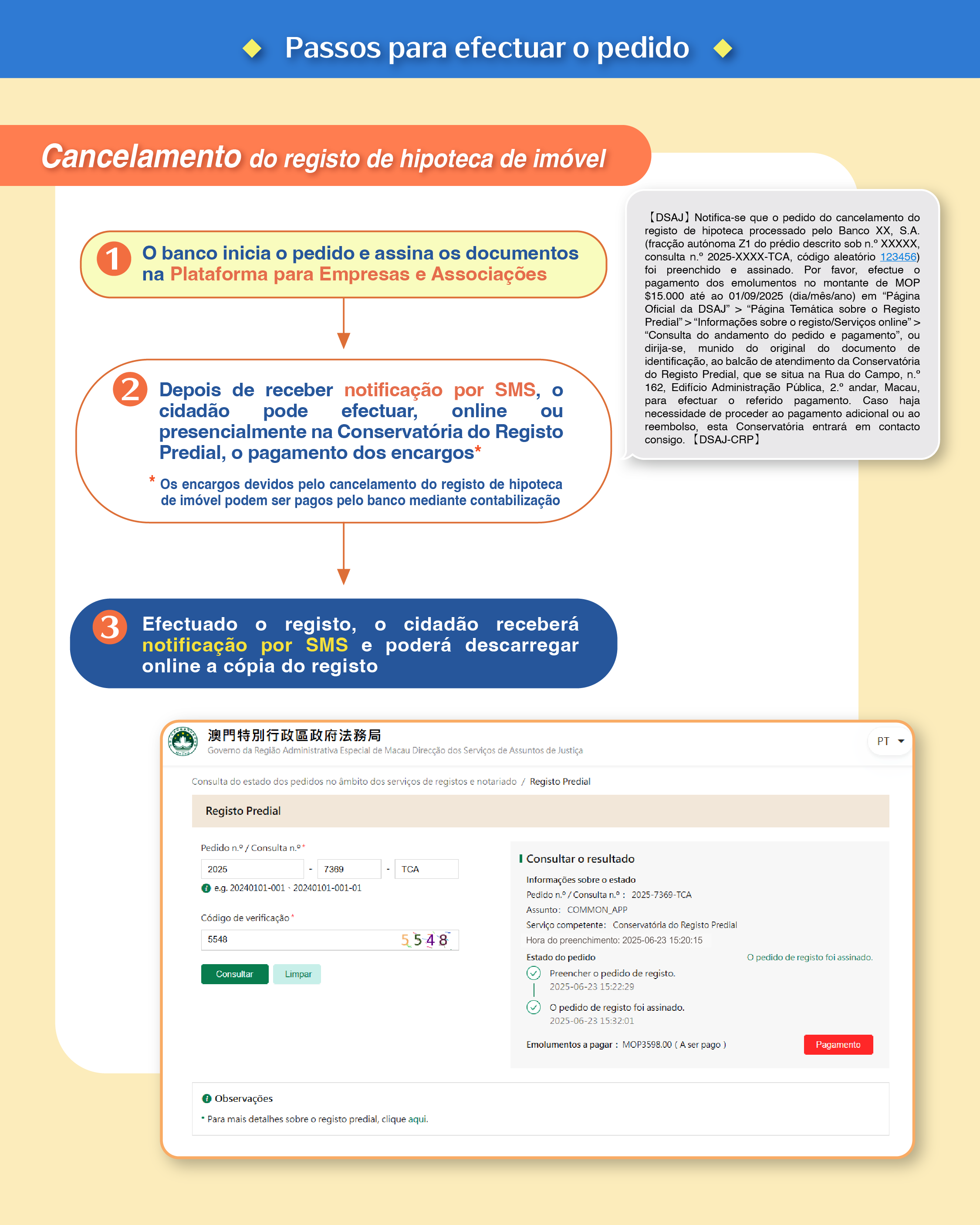 A Direcção dos Serviços de Assuntos de Justiça (DSAJ) lança, a partir de hoje (dia 30 de Junho), vários serviços totalmente electrónicos no domínio de registos e notariado, entre os quais se incluem o registo inicial de empresário comercial, pessoa singular, a alteração do domicílio (endereço) de empresário comercial, pessoa singular, o cancelamento do registo de empresário comercial, pessoa singular, a certidão de admissibilidade de firma, o cancelamento do registo de hipoteca de imóveis (extinção da hipoteca imobiliária) e de automóveis, entre outros serviços, o que proporciona ainda mais uma maior conveniência aos cidadãos e às empresas e melhora a eficiência administrativa.