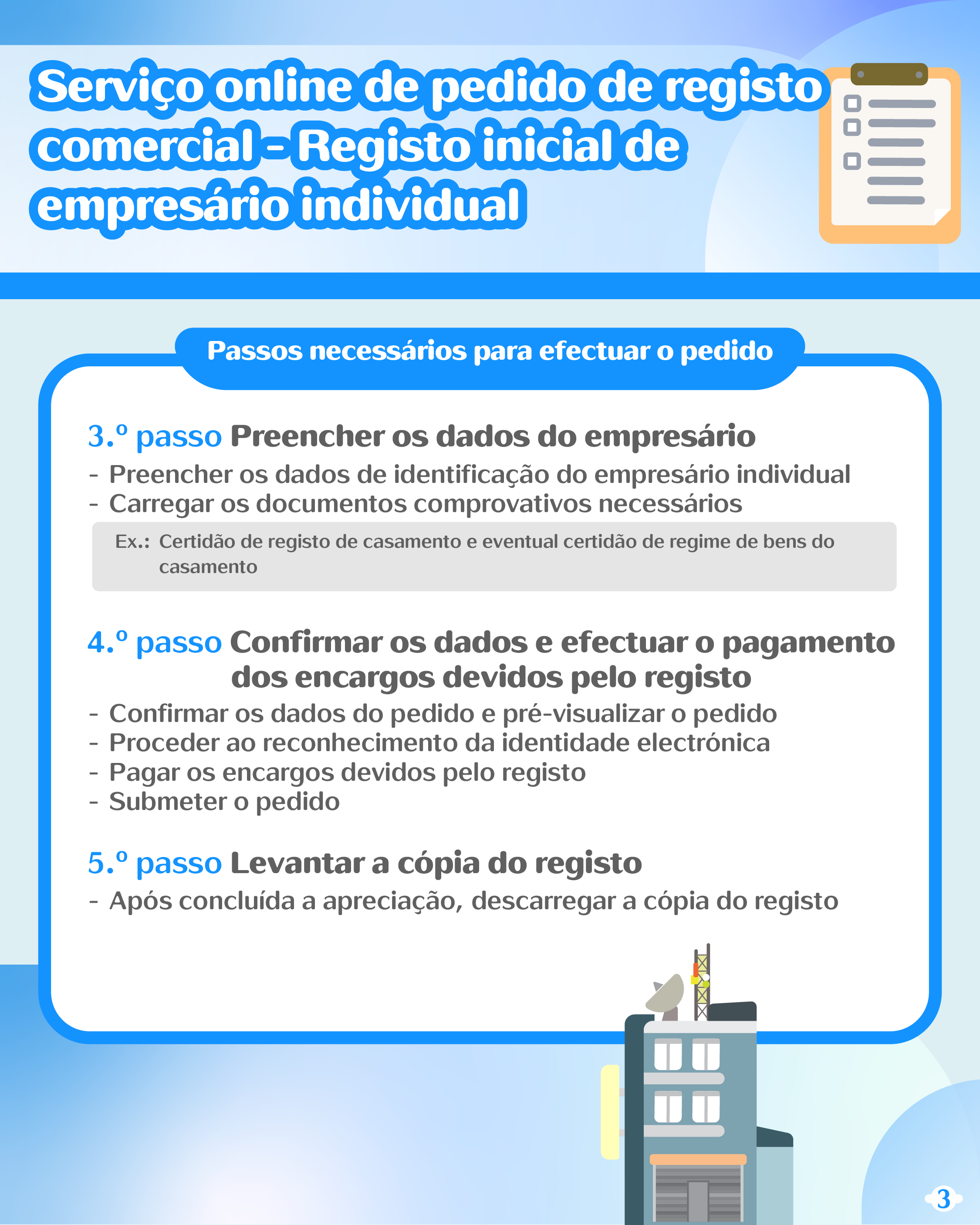 Relativamente ao registo comercial, são lançados novos serviços totalmente electrónicos do registo inicial de empresário comercial, pessoa singular, da alteração do domicílio (endereço) de empresário comercial, pessoa singular e do cancelamento do registo de empresário comercial, pessoa singular. Para tal, os cidadãos podem apresentar os pedidos, efectuar o pagamento dos encargos e levantar a cópia do registo através da Plataforma para Empresas e Associações, contribuindo assim para a concretização do novo modelo do tratamento de assuntos por via online.