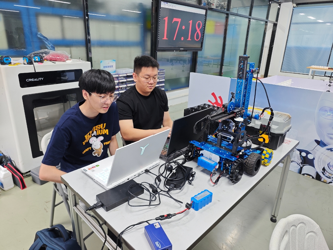 • Os concorrentes Lyu Jin (esquerda) e Feng Ka Wai (direita), em robô móvel autónomo