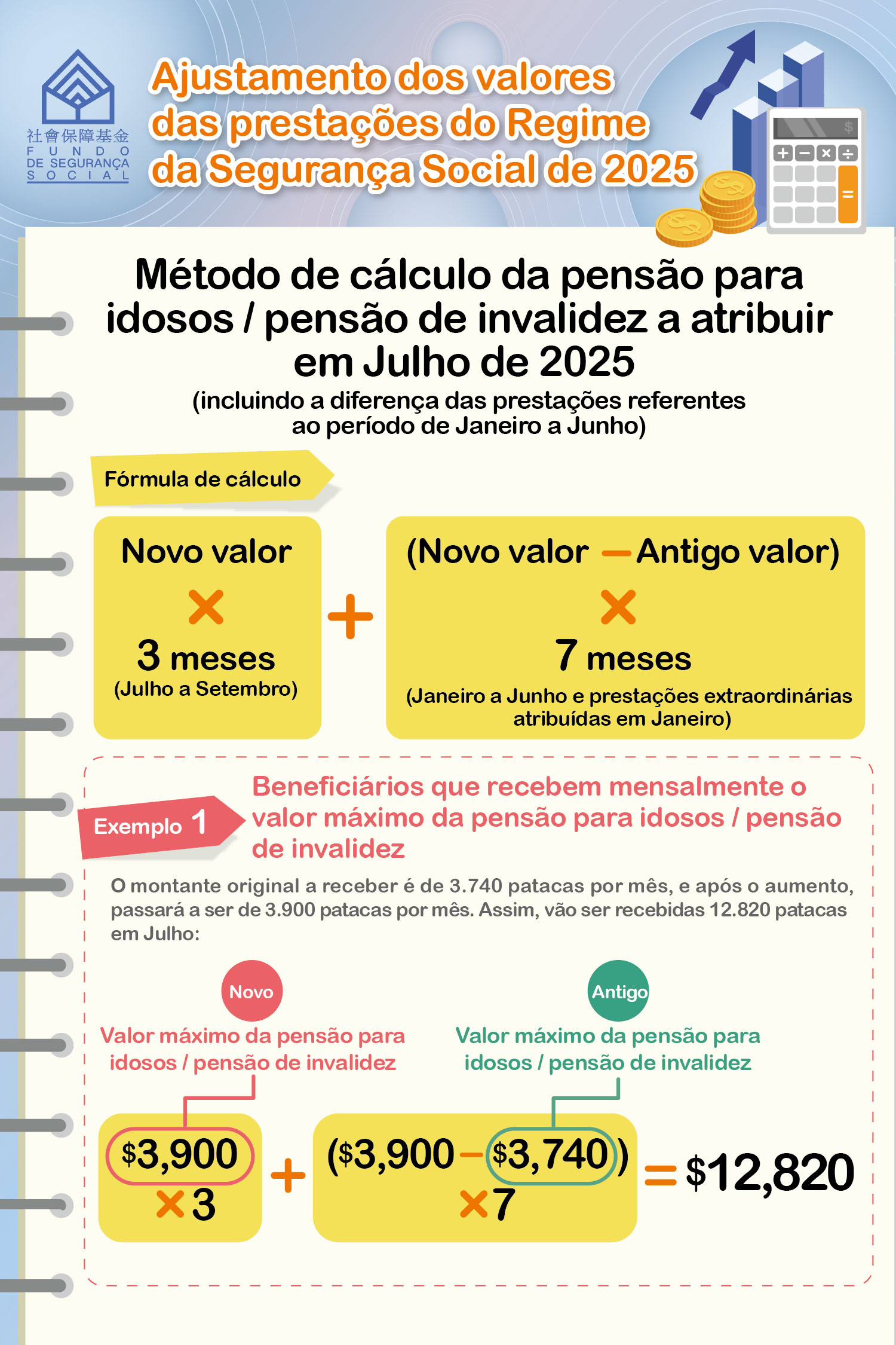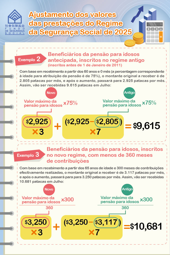 De acordo com o Despacho do Chefe do Executivo n.º 116/2025, os valores das prestações no âmbito do regime da segurança social são aumentados, com efeitos retroactivos a partir de 1 de Janeiro de 2025. A diferença dos valores referente às prestações de Janeiro a Junho será depositada em Julho nas contas bancárias indicadas pelos respectivos beneficiários.