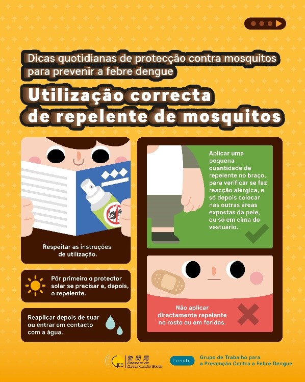 Tendo em conta o aumento significativo das doenças transmitidas por mosquitos nas regiões vizinhas e o elevado risco de transmissão em Macau devido à frequente circulação de pessoas em Macau, com o 1.º caso local da febre de dengue em Macau registado no dia 5 de Julho e o 1.º caso importado da febre chikungunya em Macau registado no dia 18 de Julho, os Serviços de Saúde apelam mais uma vez ao público para se prevenir contra a febre de dengue e a febre chikunjaya, entre outras doenças transmissíveis que podem ser transmitidas por mosquitos, e em caso de apresentar sintomas suspeitos, deve recorrer de imediato ao médico, com vista a assegurar a saúde dos residentes.