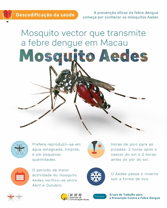 O período de Abril a Outubro é geralmente o período de pico da actividade dos mosquitos Aedes Albopictus em Macau, e como actualmente nos encontramos no período de alto risco de transmissão da febre de dengue, os Serviços de Saúde continuam a prestar estreita atenção à situação epidemiológica da febre de dengue em Macau e nas regiões vizinhas, e a tomar medidas preventivas adequadas.