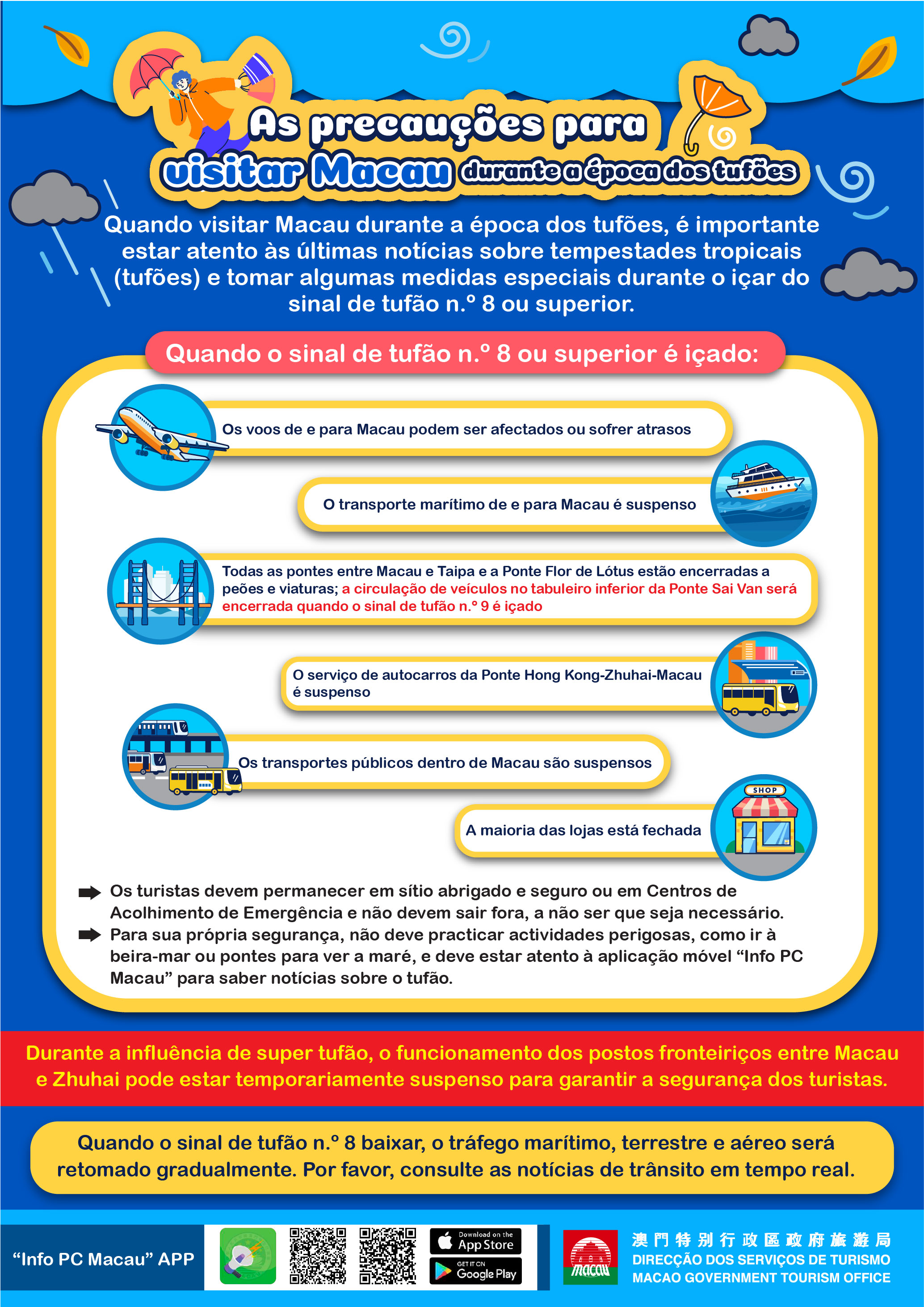 Durante o período em que vigore em Macau o sinal n.° 8 ou superior de tempestade tropical, é suspenso o funcionamento dos balcões de Informações Turísticas, e temporariamente encerrados o Museu do Grande Prémio de Macau e o Edifício Ritz.Estão suspensas as exposições das instalações ao ar livre do projecto “POP MART MACAO CITYWALK” bem como a troca de lembranças, e a “Festa Internacional das Cidades de Gastronomia, Macau 2025” encerrou antecipadamente.