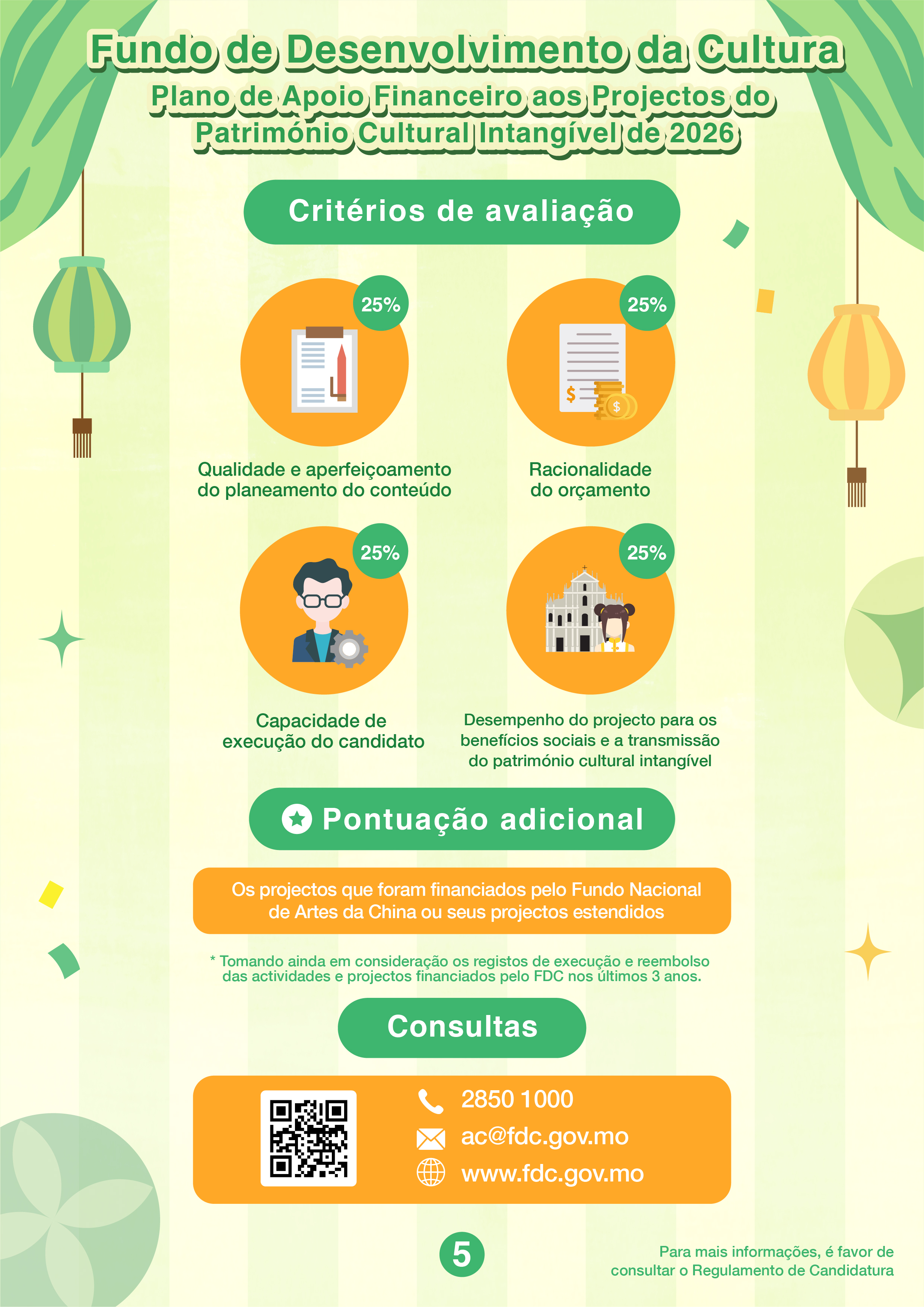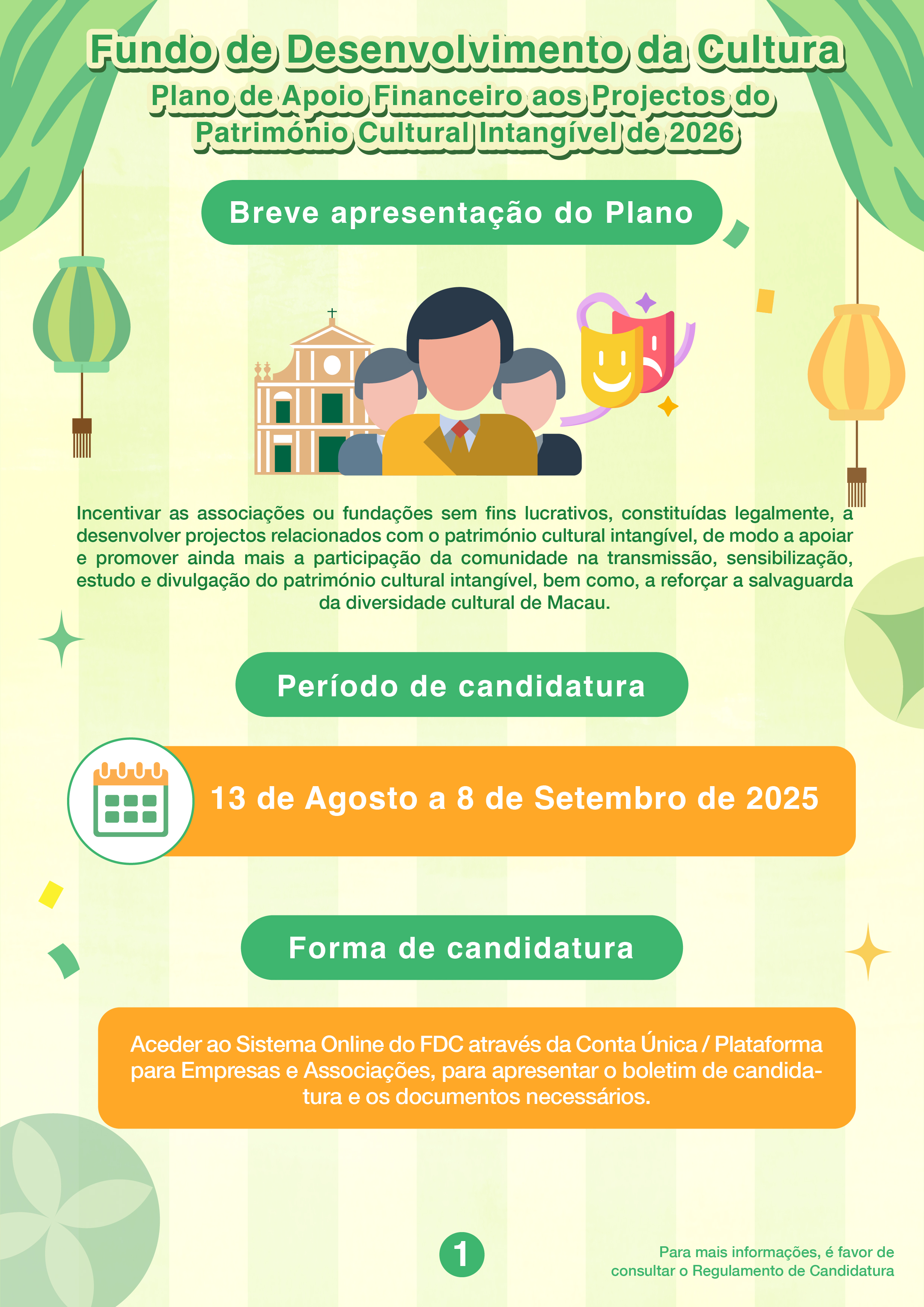 O Fundo de Desenvolvimento da Cultura (FDC) lança, pela primeira vez, o “Plano de Apoio Financeiro aos Projectos do Património Cultural Intangível de 2026”, aceitando ainda as candidaturas ao “Plano de Apoio Financeiro para Actividades/Projectos Culturais de 2026”. Ambos os períodos de candidatura decorrerão de 13 de Agosto a 8 de Setembro de 2025.