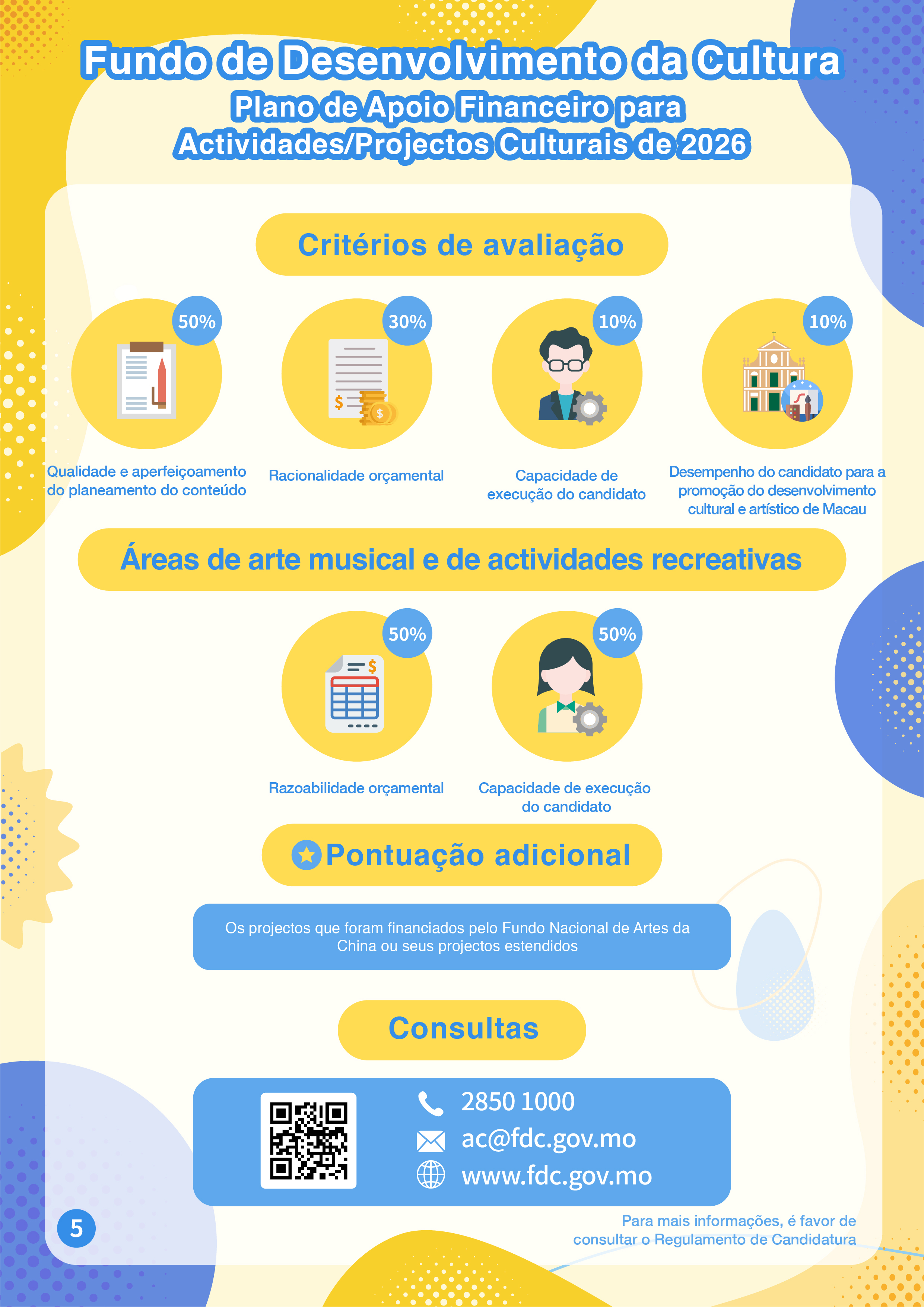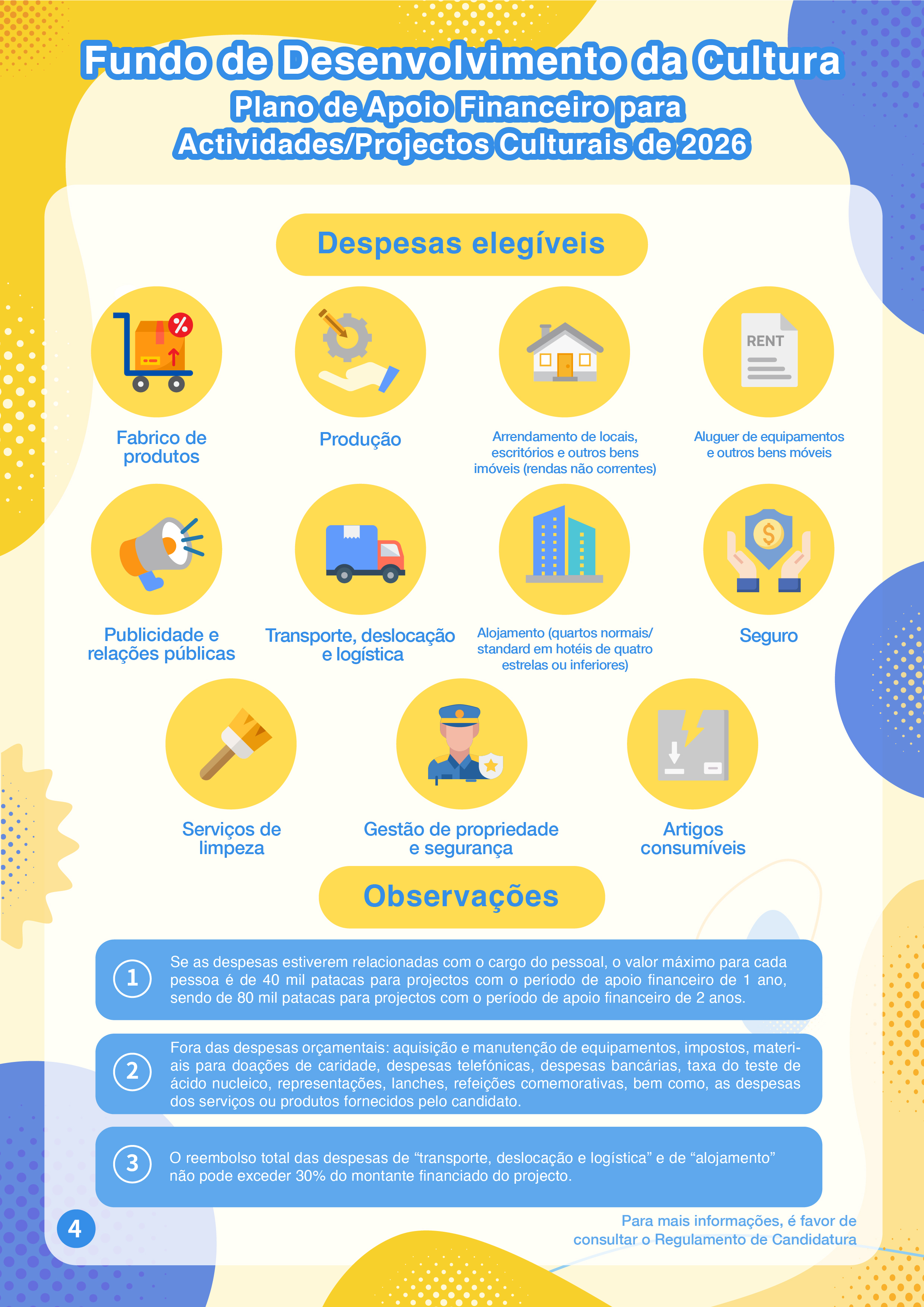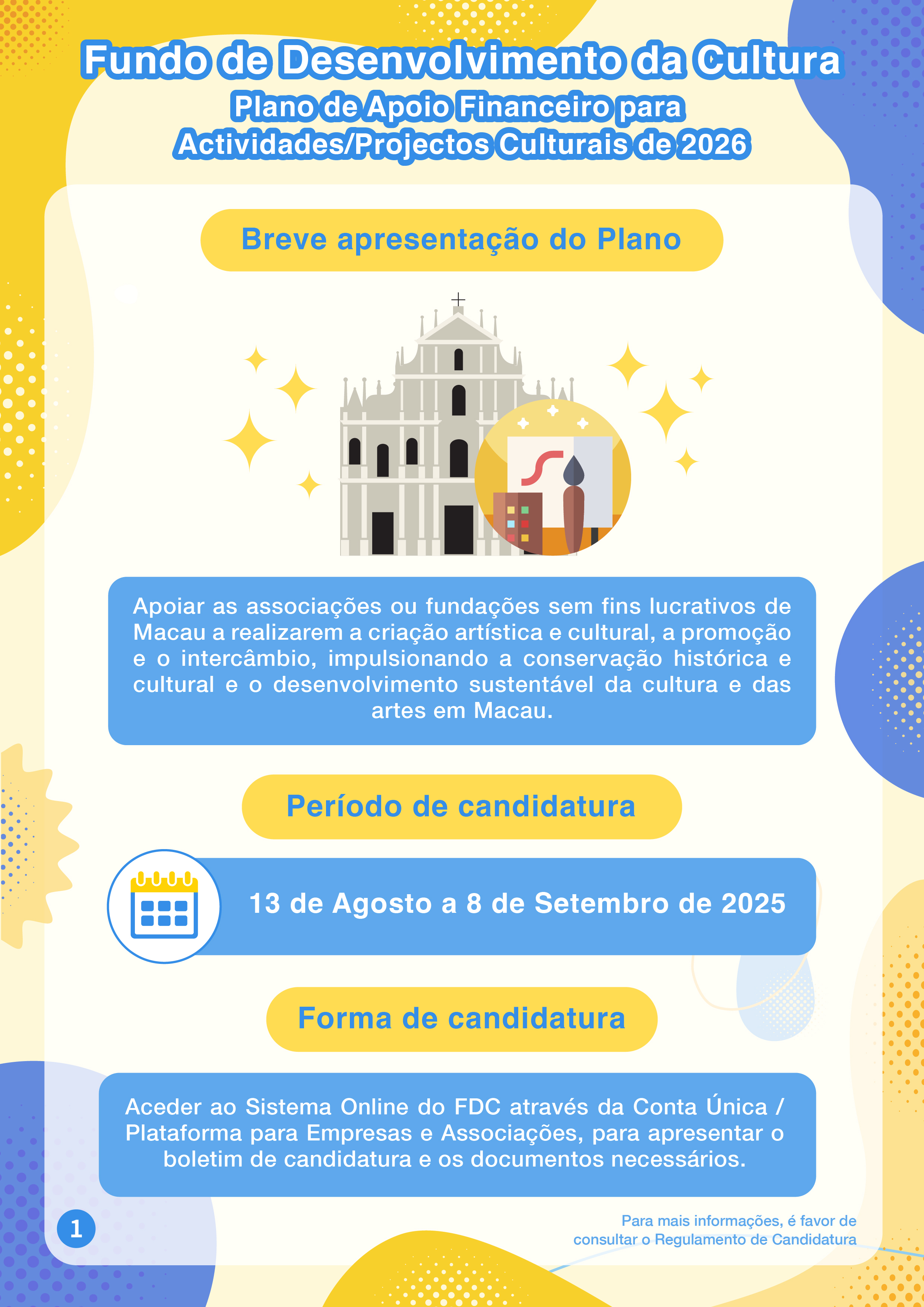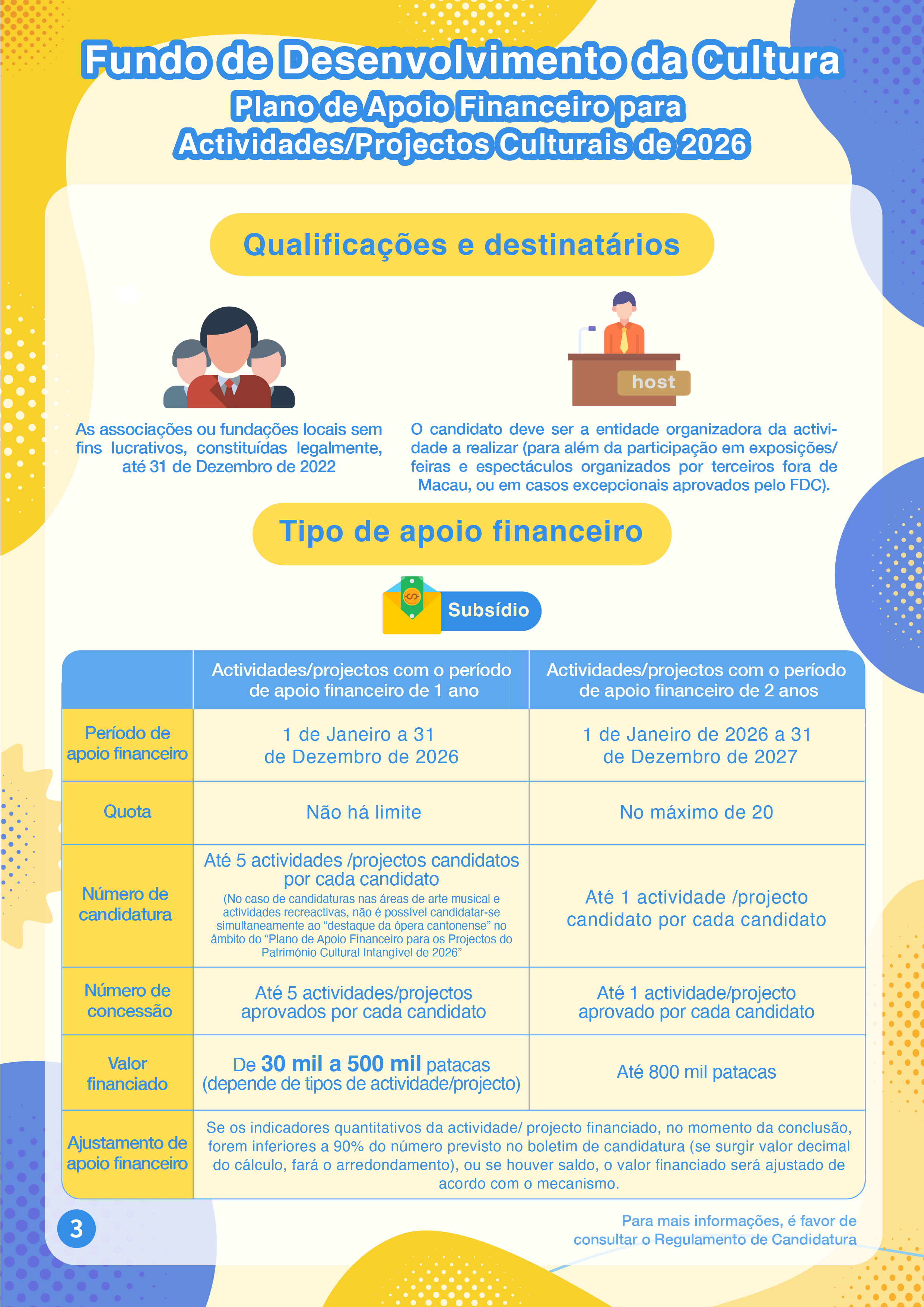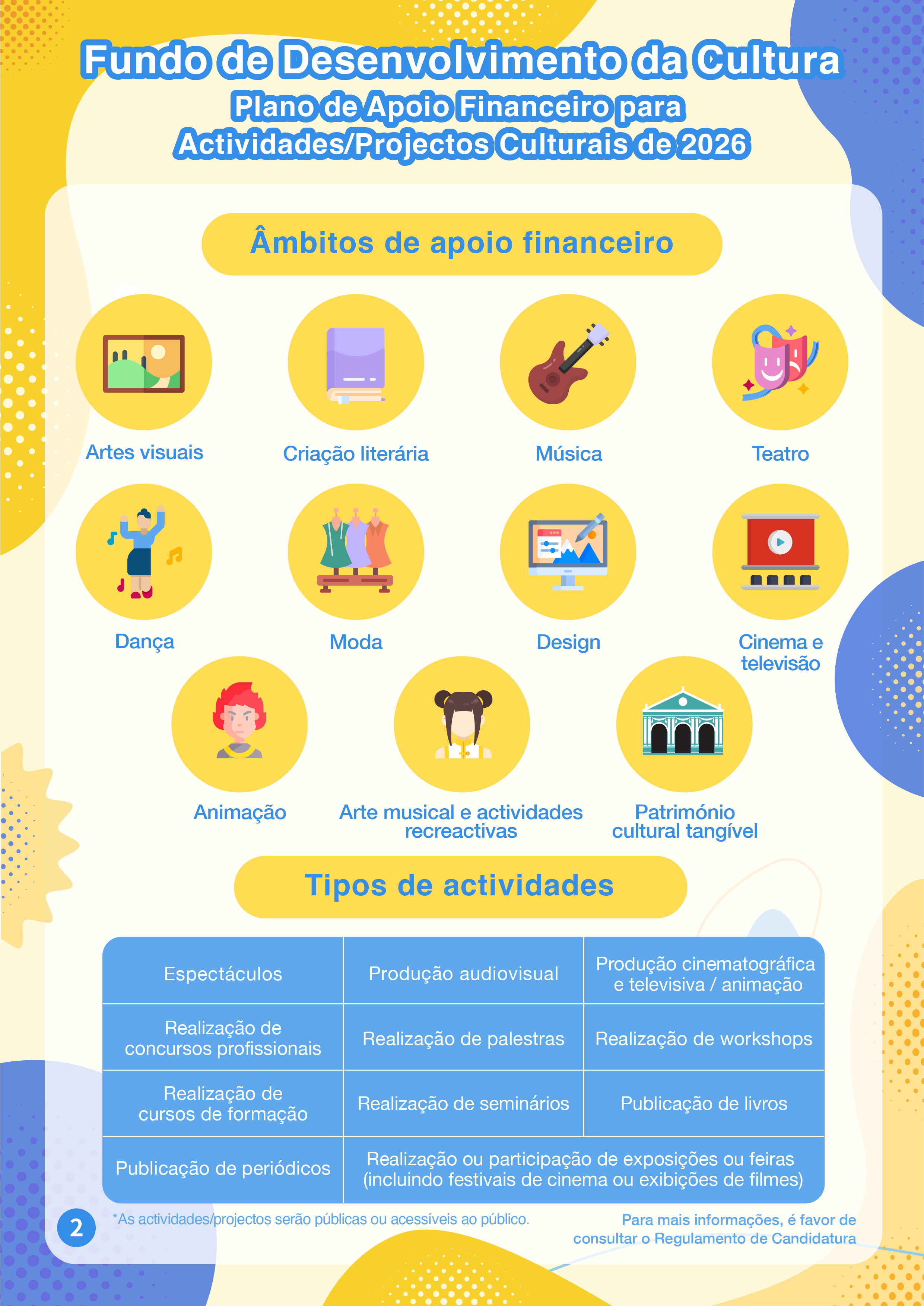 O “Plano de Apoio Financeiro para Actividades/Projectos Culturais de 2026” visa apoiar as associações ou fundações locais na realização de criação, promoção, actividades e intercâmbios nas áreas culturais e artísticas, promovendo ainda a conservação da história e da cultura locais. Este Plano abrange várias áreas artísticas e culturais, incluindo artes visuais, criação literária, música, arte musical (incluindo diálogo musical) e actividades recreactivas (canções clássicas e populares), teatro, dança, património cultural tangível, moda, design, cinema e televisão, animação. A modalidade do apoio financeiro deste Plano é por subsídios, podendo o período de apoio financeiro ser 1 ou 2 anos.