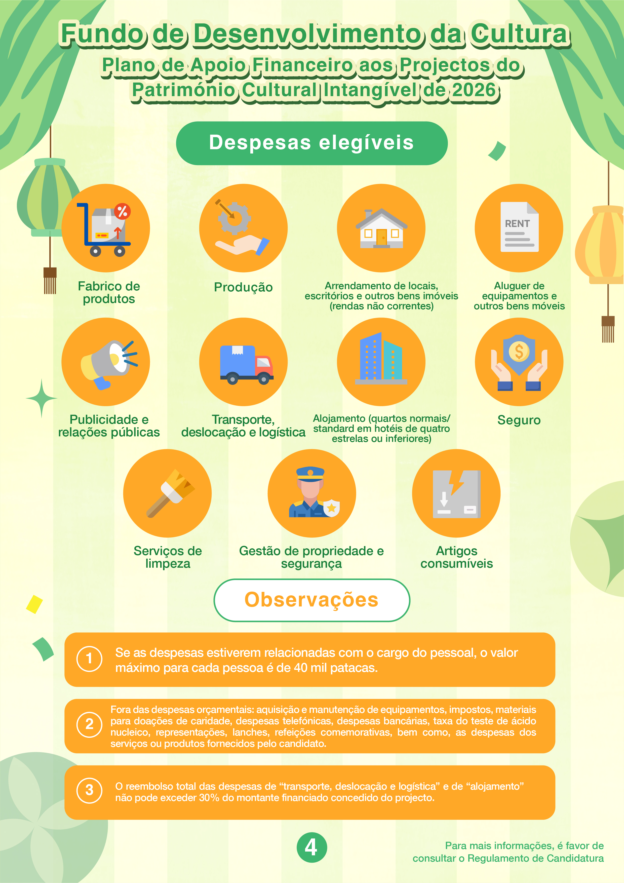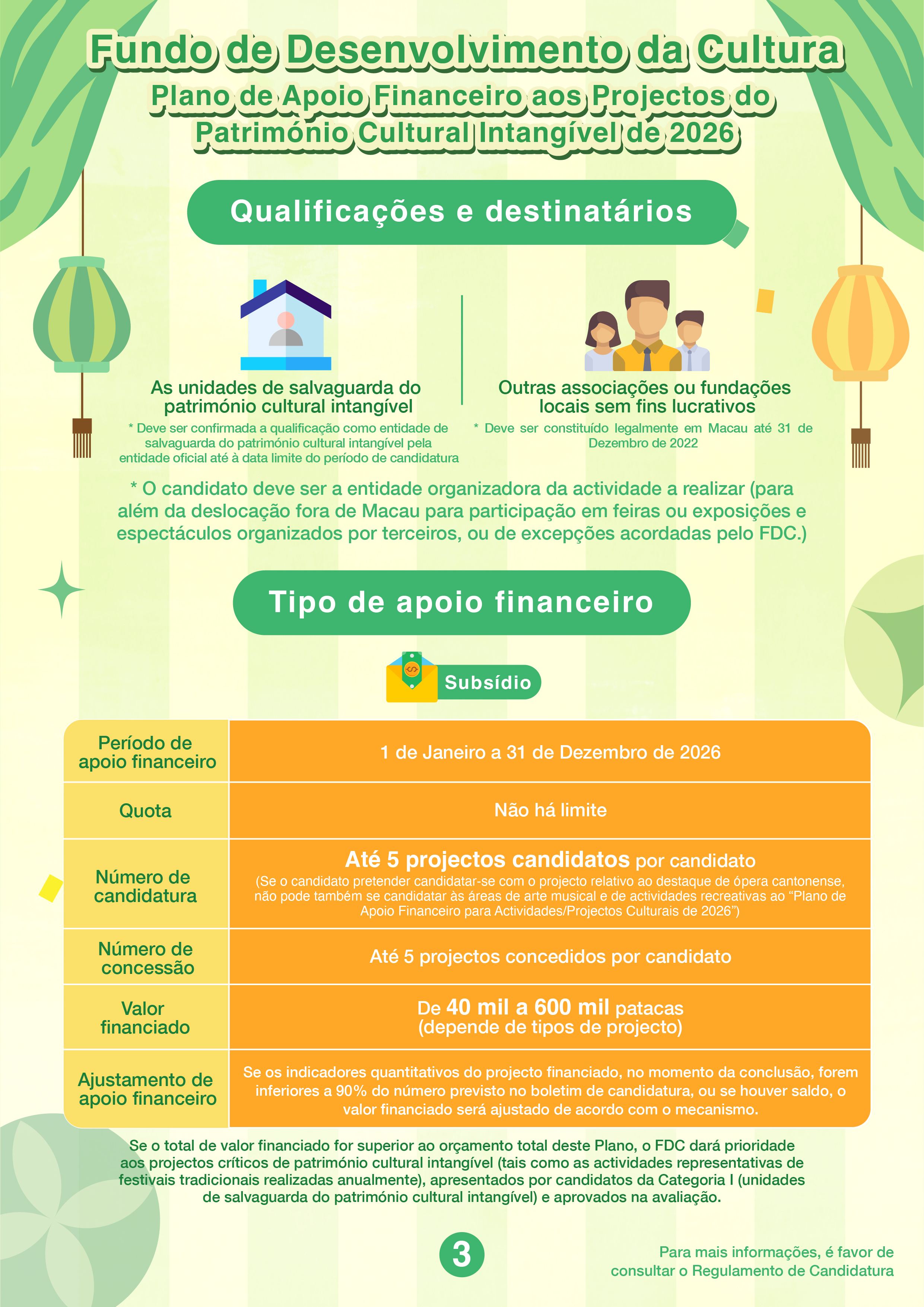 O “Plano de Apoio Financeiro aos Projectos do Património Cultural Intangível de 2026” visa incentivar as entidades que se dedicam à salvaguarda do património cultural intangível, associações ou fundações locais a apresentarem projectos candidatos, no intuito de promover a participação da comunidade na transmissão, sensibilização, estudo e divulgação do património cultural intangível. O âmbito de apoio financeiro é limitado aos projectos já incluídos na Lista e no Inventário do Património Cultural Intangível de Macau, incluindo candidaturas cujo conteúdo seja inteiramente constituído por destaque de ópera cantonense, podendo outros projectos relacionados de arte musical candidatar-se ao “Plano de Apoio Financeiro para Actividades/Projectos Culturais”. A modalidade do apoio financeiro deste Plano é por subsídios, com o período de apoio financeiro de um ano.