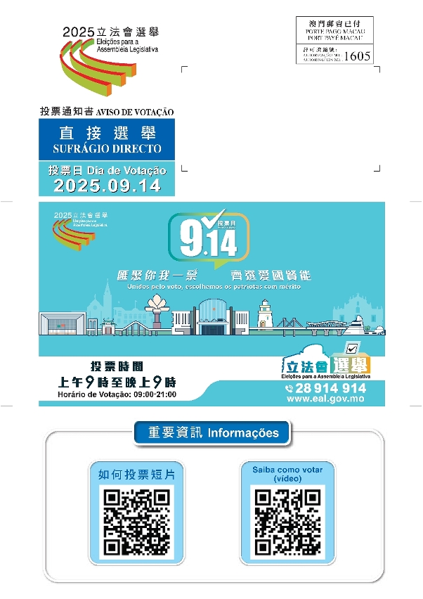 Além do aviso de votação, os eleitores podem ainda consultar a assembleia de voto atribuída através da conta única, da página electrónica das eleições (www.eal.gov.mo), do sistema de consulta viva-voz da linha aberta (n.º 28 914 914), e dos quiosques de auto-atendimento instalados em 50 locais de Macau, Hengqin, e em quatro cidades da Grande Baía (Cantão, Zhuhai, Zhongshan e Jiangmen).