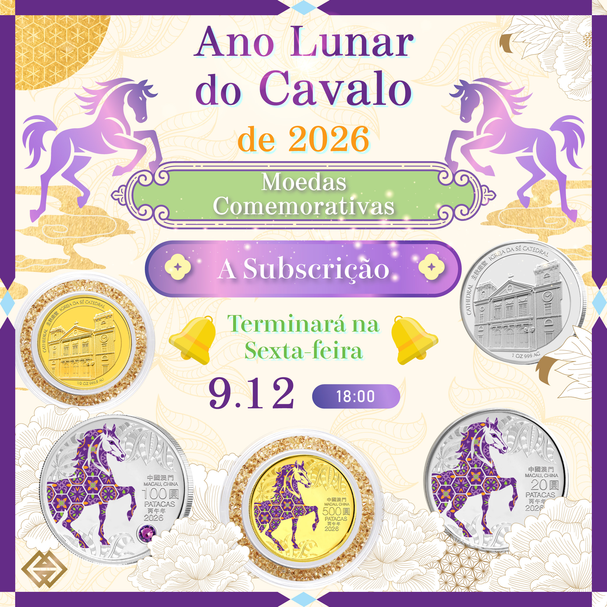 O prazo para a subscrição “on-line” das moedas comemorativas do Ano Novo Lunar do Cavalo (2026) termina às 18 horas do dia 12 de Setembro de 2025 (sexta-feira). Assim sendo, a AMCM alerta os residentes de Macau interessados na troca das referidas notas e da caixa para o facto de estes deverem proceder, o mais cedo possível, à referida subscrição “on-line”.