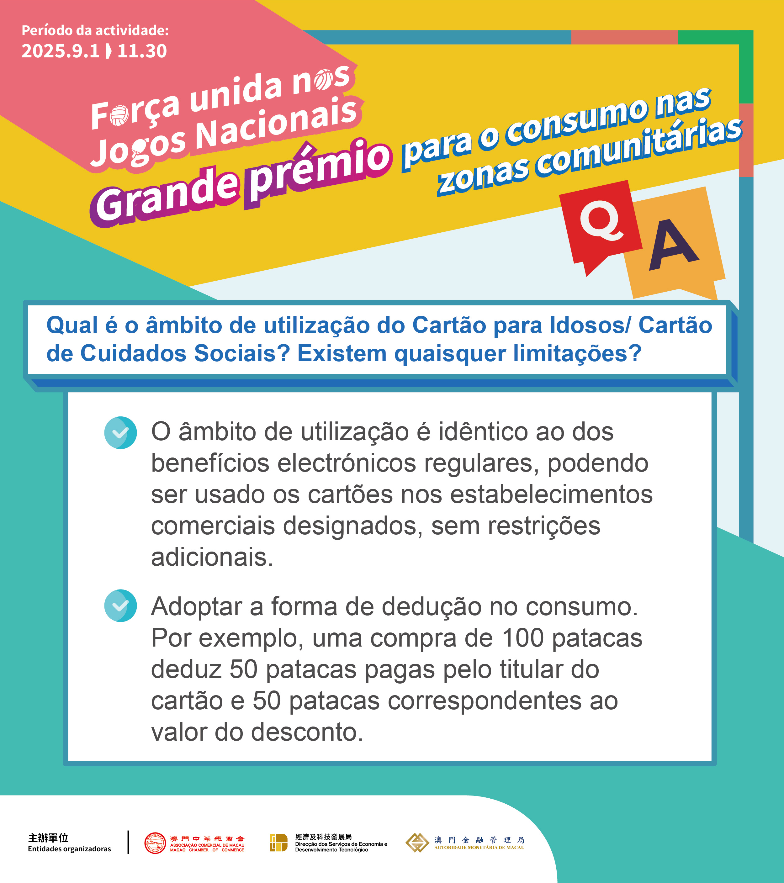 Esta actividade concede adicionalmente benefícios de desconto imediato no consumo no valor de 500 patacas associados ao Cartão para Idosos e ao Cartão de Cuidados Sociais. Os idosos podem, munidos do Cartão da Macau Pass para Idosos da nova versão, efectuar o carregamento do Cartão nos leitores instalados em mais de 100 postos de serviços designados em Macau; e os titulares do Cartão de Registo de Avaliação da Deficiência podem levantar um Cartão de Cuidados Sociais nas instituições e centros coordenados pelo Instituto de Ação Social, mediante apresentação do documento. Os benefícios de desconto imediato podem ser utilizados todos os dias durante o período da actividade e não estão sujeitos a um limite de utilização diária. Em cada transação, 50% do valor será deduzido directamente do saldo dos benefícios de desconto imediato, sendo os restantes 50% deduzidos do saldo do seu próprio dinheiro. Os benefícios de desconto imediato não utilizados serão expirados no fim da actividade, o que não afectará o valor do seu próprio dinheiro. Os residentes podem, conforme a necessidade, carregar o cartão com o próprio dinheiro em mais de 400 postos de carregamento do cartão Macau Pass.