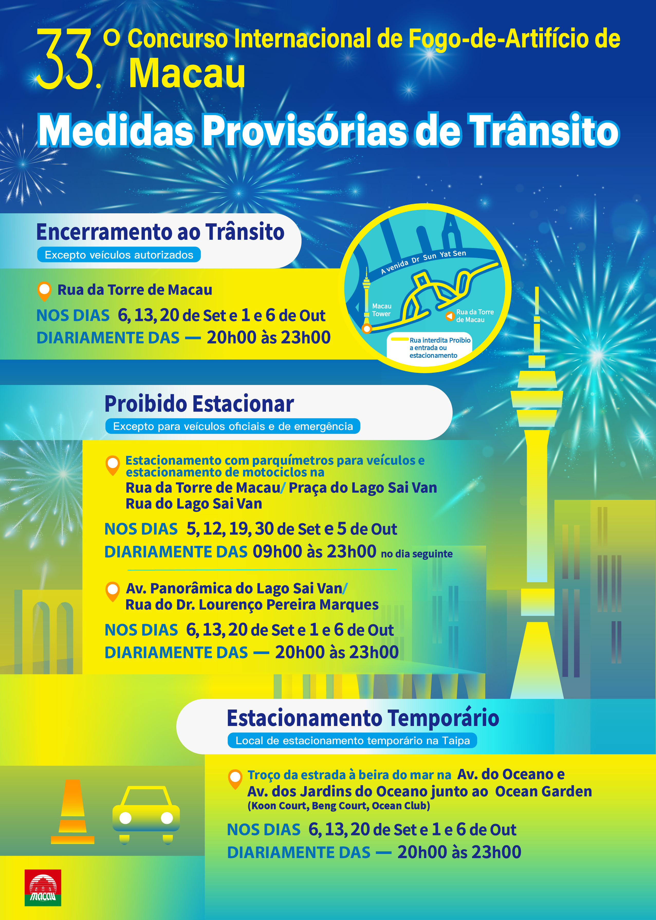 Durante as exibições do CIFAM serão implementadas medidas provisórias de controlo nas vias envolventes: nas zonas de estacionamento com parquímetro para carros e motos na Rua da Torre de Macau, Praça do Lago Sai Van e Rua do Lago Sai Van, e ainda na Avenida Panorâmica do Lago Sai Van, Rua do Dr. Lourenço Pereira Marques, e na Avenida do Oceano e na Avenida dos Jardins do Oceano da Taipa, junto dos Jardins do Oceano. Solicita-se a atenção do público para as respectivas medidas de condicionamento.