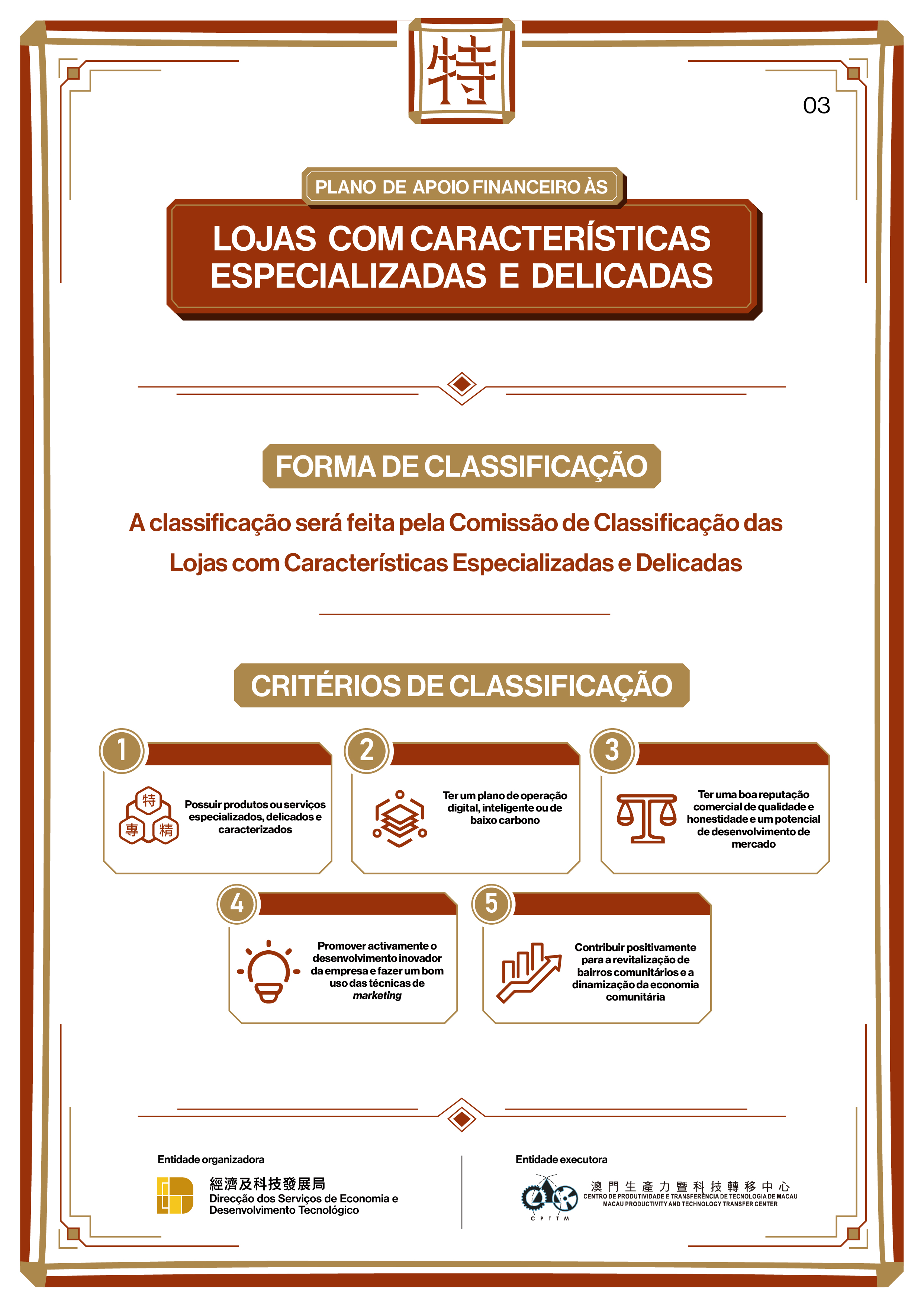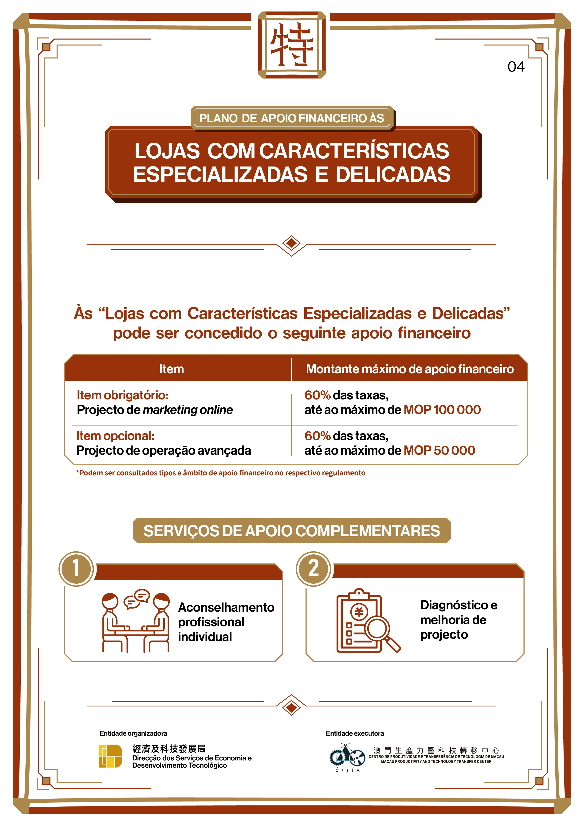 As PME classificadas como “Lojas com Características Especializadas e Delicadas” podem receber um financiamento no valor de 60% das taxas designadas relacionadas com a implementação de marketing online, criação de montras distintas e lançamento de produtos de colaboração com IP, sujeito a um limite máximo de 150.000 de patacas. Além disso, a entidade executora fornecerá aconselhamento profissional individual às “Lojas com Características Especializadas e Delicadas”, e realizará diagnóstico e melhoramento do plano de negócio e projecto de exploração.
